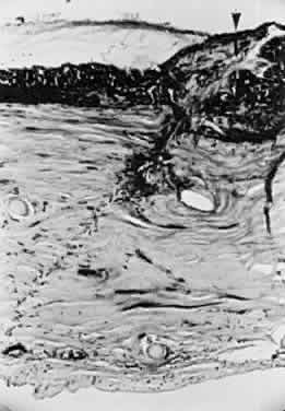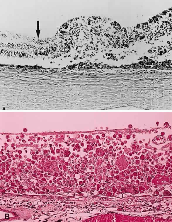 Fibrous tissue may originate from the choroid and proliferate through breaks in Bruch's membrane into the subpigment epithelial or subretinal spaces,4 hence the white appearance of disciform macular degeneration (Fig. 16). Fibrous tissue also may originate from fibroblasts located in the adventitia of retinal vessels and may contribute to the white appearance of vascularized membranes (Fig. 17A), such as those seen in proliferative diabetic retinopathy (see Fig. 17B) or arterioles after vascular occlusion (see Fig. 6). The accretion of collagen in the wall of the vessel in arteriolosclerosis may thicken the vessel wall (see Fig. 5) and alter the color of the blood column to a copper or silver color. Injury to the pigment epithelium results in scar formation (Fig. 18). Collagen deposition from pigment epithelium metaplasia may be identified by the presence of pigment within a scar (Fig. 19). Injured nonpigmented epithelium may undergo similar fibrous metaplasia and may contribute to the formation of membranes such as cyclitic membranes in the region of the ciliary body.