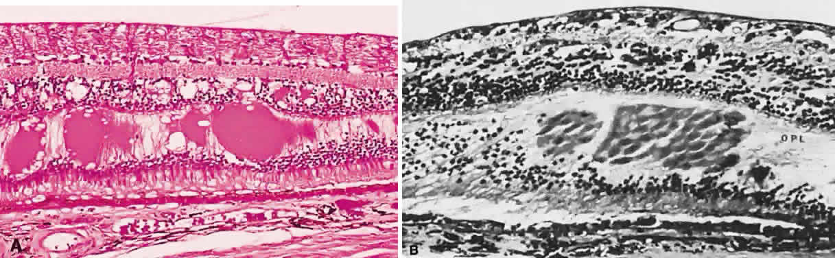 of nerve fiber layer infarcts and hemorrhages in the periphery. Among the ophthalmoscopically observed conditions peculiar to the retinal periphery are the phenomena of “white-with-pressure” and “whitewithout-pressure.”22 White-with-pressure may be observed in the retinal periphery during scleral depression. The retina overlying the scleral indentation transiently opacifies; this opacification resolves when the external pressure on the scleral is released. The pathophysiologic explanation for the phenomenon of white-with-pressure is not clear. On the other hand, white-without-pressure does have a pathophysiologic explanation. In white-without-pressure, the retina also appears to be opacified, but the opacification is unrelated to external pressure on the scleral. White-without-pressure may have poorly defined or sharp borders, delineating the posterior edge of the vitreous base. It is seen commonly in elderly patients, adjacent to the ora serrata, and most commonly in darkly pigmented patients and in Asians, especially those who are myopic. Three distinctive retinal degenerations occur frequently in the periphery: peripheral cystoid degeneration, lattice degeneration, and paving stone degeneration. Typical cystoid degeneration involves the formation of cyst-like spaces at the level of the outer plexiform layer (Blessig-Iwanoff cysts) (Fig. 59). These are common lesions, present in most persons from the first decade of life. These “cysts” appear to become more numerous with age. Coalescence of these cysts may result in “senile” retinoschisis.23 Reticular cystoid degeneration involves a disruption at the level of the nerve fiber layer. It is located frequently just posterior to the area of typical cystoid degeneration. A network of fine, branching blood vessels is seen commonly over the surface of reticular cystoid degeneration. Degenerative or senile retinoschisis involves a splitting of the retina at the level of the outer plexiform layer for a distance of at least one disc diameter. As seen ophthalmoscopically, degenerative retinoschisis frequently has a “beaten metal” appearance, and fine, white dots may be seen within the cavity. These dots are thought to represent columns of Müller cells that have been stretched to the point of rupture: the clinically observed dots are Müller cell remnants that remain adherent to the internal limiting membrane. These Müller columns are believed to be responsible for the unevenness of the outer schisis surface; the inner surface is typically smooth. Large holes in the outer wall of the schisis cavity (by convention, “outer” refers to the scleral side of a retinal lesion whereas “inner” refers to the vitreous side of the retina) are frequently observed (Fig. 60), although smaller inner layer holes are less common. The presence of holes in both the inner and outer walls of a schisis cavity creates a pathway from the vitreous to the subretinal space, and a rhegmatogenous retinal detachment may develop. In retinal lattice degeneration, there is thinning of the inner retinal layers with loss of the internal limiting membrane. These changes are associated with liquefaction of the overlying vitreous. In addition, strong vitreoretinal adhesions are present at the edges of the lattice lesion (Fig. 61A). These adhesions are important because in the event of a posterior vitreous detachment, traction on the posterior edge of the lattice lesion may result in a tear (see Fig. 61B). The fluid behind the detached vitreous may gain access to the subretinal space through the retinal break and lead to separation of the neurosensory retina from the pigment epithelium, the process known as retinal detachment. Atrophic retinal holes may appear in the thinned zone of retina, but these small asymptomatic holes do not carry the same ominous prognostic implications for retinal detachment as the retinal tears. Ophthalmoscopically, retinal lattice degeneration appears as punched-out lesions located between the ora serrata and the equator. The lesions may be oriented either equatorially or radially and may be pigmented (so-called “pigmented lattice”) (see Fig. 61C). The name is derived from the presence of white lines criss-crossing within the thinned retina (see Fig. 61D). The lines seen clinically are blood vessels with hyalinized walls. The vessels are patent, an observation that can be confirmed clinically by fluorescein angiography. These lines, however, are not present in every case, so that clinical recognition of retinal lattice degeneration often is based on the clinical context of retinal thinning and geographic location. In contrast to lattice degeneration, which affects the inner retinal layers, paving stone degeneration (cobblestone degeneration, peripheral chorioretinal degeneration) affects the outer retinal layers.24 Ophthalmoscopically, paving stone lesions appear as well-demarcated concave zones of depigmentation (Fig. 62A and B). Frequently, the depigmentation is so marked that the larger, outermost choroidal vessels may be seen running through the lesion. The lesions usually are located just posterior to the ora serrata. These depigmented zones may appear individually or may coalesce into larger lesions that demonstrate a scalloped border with pigmented edges. Histologically, there is loss of the outer retinal layers, including the retinal pigment epithelium (see Fig. 62C). The loss of pigment epithelium accounts for the color of the lesion and permits the larger choroidal vessels to be viewed ophthalmoscopically. The thinned neurosensory retina is firmly adherent to underlying Bruch's membrane and to the reactive pigment epithelium at the margins of the lesion. The pigment epithelial changes account for the clinically observed black border of these zones. Unlike retinal lattice degeneration, there is no change in the overlying vitreous and no pathogenic relation to retinal detachment. In fact, the histopathologic appearance 