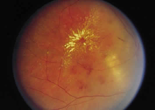 Transudation and exudation imply vascular leakage. A transudate consists of serum and has a low concentration of proteins and lipoproteins. Transudation occurs when there is an imbalance in Starling's factors (the intravascular pressure, the tissue turgor, and osmolarity of the intravascular and tissue spaces). Exudation occurs when there is damage to the vessel, allowing nonselective escape of plasma components such as higher molecular weight proteins and lipoproteins. Therefore, whenever exudate is seen ophthalmoscopically, the examiner should be prepared to attribute this finding to specific vascular abnormality. Exudates appear yellow or yellow-white, depending on the amount of lipid present. When exudates are observed ophthalmoscopically over time, they frequently appear to lose the yellow component as the content of lipid in the deposit diminishes. Exudates are removed by vascular resorption or by phagocytosis. Exudates tend to accumulate in the outer plexiform layer. Since this layer is oriented perpendicularly to the internal limiting membrane, small exudates assume a cylindrical shape in three dimensions. When small exudates are viewed ophthalmoscopically, they appear round because the cylinder is being viewed in a cross-section. Usually, these small exudates can be distinguished from cotton-wool spots (which are not exudates but are nerve fiber layer infarcts) by location, shape, and color; nerve fiber layer infarcts occupy a more superficial location, tend to have less distinct edges, and are more white than yellow. The amount and geographic location of the exudate may alter the appearance of the lesion. Larger exudates appear more globoid (Fig. 40A) than the smaller exudates described earlier. Exudates that accumulate in the macula still may occupy the outer plexiform layer, but because this layer is oriented obliquely (see Fig. 40B), the examiner sees the cylindrical accumulations in profile rather than in cross-section. These exudates resemble the spokes of a wheel radiating from a central hub or the spokes of light radiating from a star (“macular star”) (Fig. 41).