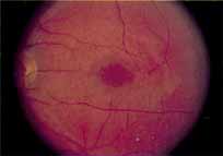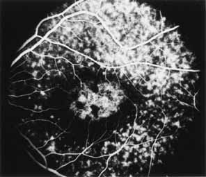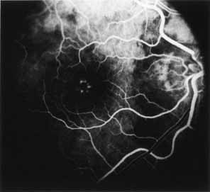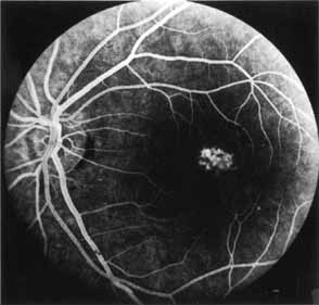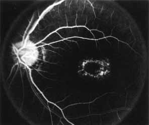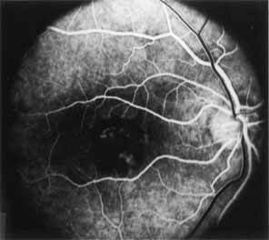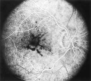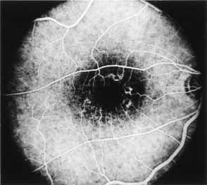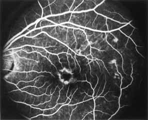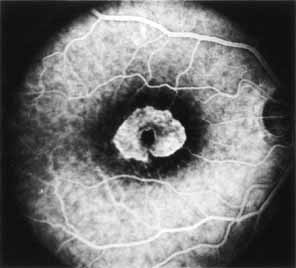 In the early stages of the dystrophy, the optic disc, retinal vessels, and peripheral retina are usually normal. The patient may have a visual acuity of 20/200 and normal color vision by standard testing and, yet, generalized cone dysfunction can be demonstrated by color field testing. In the late stages, there may be temporal optic disc pallor, attenuation of the retinal arterioles, and granular or bone spicule peripheral retinal pigmentary changes. Not infrequently, the peripheral pigmentary abnormalities may be regional. This probably reflects regional rod involvement, as evidenced by ERG, which may demonstrate a reduction in amplitude without a change in latency of the rod responses.72,80 At this stage, contracted peripheral fields may be found on both white and color target testing. No medical treatment is available. The prognosis for vision is guarded and poorer than for the other cone dystrophies because both cone and rod function is impaired in the macula and retinal periphery. Accordingly, central vision is decreased and color vision impaired in association with contraction of the peripheral visual fields. As the dystrophy progresses, vision may decrease to the 20/400 level or less and may also be accompanied by contracted peripheral fields and a total color defect. Patients with poor central vision should be referred to low visual aids. Severe photophobia in adults and children has been reduced with the use of appropriately tinted spectacles or contacts. The tint will often depend on the dystrophy as some patients with relatively well-preserved color vision require neutral tints and other more severely affected patients require red tints similar to those in rod monochromats. Miotic drops have been used in some patients with severe photophobia but are not generally well tolerated or advised. Ancillary Tests Fluorescein angiography demonstrates increased transmission of choroidal fluorescence in the macula during early phases of the study, without late leakage of dye or fluorescein staining. In addition, an annular pattern of hyperfluorescence is often seen in the macula, highlighting the bull's-eye pattern seen on fundus examination (Fig. 4). Visual field defects include central scotoma, peripheral field loss, and ring scotoma.