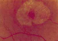 Durlu and colleagues96 described macular complications occurring in two patients including a full thickness macular hole and central retinal artery occlusion. As is the case with retinitis pigmentosa, many forms of therapy have been attempted, none of which have been successful. Ancillary Tests Tritan color defects have been reported on Ishihara and Farnsworth-Munsell testing. Despite the common presenting symptom of nyctalopia, the dark adaptometry is normal or slightly delayed.96 The angiogram in the early course of the disease is often unremarkable without evidence of retinal pigmentary derangement. Electrophysiologic Tests The primary lesion is thought to reside in the photoreceptors and the pigment epithelium, but due to the localized nature of the process, the EOG and ERG are often normal or only slightly subnormal.11,21,96 Differential Diagnosis The differential diagnosis includes classic retinitis pigmentosa (rod-cone dystrophy), progressive cone-rod dystrophy, the late stage of fundus flavimaculatus, and inflammatory and infectious causes of chorioretinitis. The ERG should enable one to differentiate this dystrophy from the progressive cone-rod dystrophies and classic retinitis pigmentosa (rod-cone dystrophy). The retinopathy of neuronal ceroid lipofuscinosis and olivo- pontoceerebeallar ataxia potentially involves the central macula in a similar presentation.96,97 DOMINANT CYSTOID MACULAR DYSTROPHY Introduction Deutman and Pinckers reported a 4-year-old female with severe hyperopia and diminished acuity.98 In addition to a pigmentary retinopathy, cystoid edema was a prominent feature.98–102 Deutman and colleagues98 further characterized three of five families with the disorder. An additional report describes an affected Greek family.101 Since that time, the gene for dominant cystoid macular dystrophy has been localized to chromosome 7p.102 Clinical Findings Dominantly inherited cystoid macular edema is characterized in the first and second decades with a prolonged course of macular cystoid change and progressive loss of central vision. The pathogenesis and prevalence of this dystrophy are as yet undetermined. Hyperopia from +2.00 to +10.00 D is seen along with hypopigmentation within the central macula. Macular atrophy is a fairly prominent finding late in the disease. Occasionally, a bull's-eye pattern of atrophic change may be seen. Vitreous cells, strands, and veils, and peripheral retinal pigmentary disturbances ranging from a slight hyperpigmentation and depigmentation to the formation of bone spicule changes have also been reported. Late in the disease, vision may be reduced to the 20/200 to finger counting range and a relative-to-absolute central scotoma may be present. No known treatment is available. Ancillary Tests Fluorescein angiography reveals leakage from perifoveal capillaries with dye pooling in a cystoid pattern. Later in the disease, transmission defects are seen in areas of RPE atrophy. In some cases, fluorescein leakage from optic disc capillaries has also been noted. Color testing in some patients often demonstrated blue yellow defects likely secondary to macular edema and in chronic cases red green deficiencies secondary to photoreceptor damage. Electrophysiologic Studies The ERG has been normal in all patients studied to date. The EOG and results of dark adaptometry, however, are subnormal in most, but not all, patients. The subnormal EOG would indicate widespread dysfunction of the retinal pigment epithelium. Differential Diagnosis The condition should be differentiated from other hereditary retinal disorders that are associated with cystoid macular edema, especially retinitis pigmentosa (rod-cone dystrophy), and dystrophies characterized by the presence of foveal retinoschisis (which may be mistaken for cystoid macular edema) such as X-linked juvenile retinoschisis and familial foveal retinoschisis. Cystoid macular edema is seen after ophthalmic surgeries, pars planitis, and other ocular inflammatory disorders. Vascular disorders such as diabetic retinopathy, Coat's disease, and parafoveal telangectasis also cause cystoid macular edema. Finally, high dose nicotinic acid has been reported to cause cystoid edema without obvious leakage from perifoveal capillaries.103 FENESTRATED SHEEN MACULAR DYSTROPHY Introduction Fenestrated sheen macular dystrophy is an autosomal dominant condition with high penetrance. This is a rare disorder and only four affected pedigrees have been reported in the literature.104–106 Clinical Findings Fenestrated sheen macular dystrophy is a slowly progressive disease that develops in childhood.103–107 The youngest reported case was in a 4-year-old girl. In the early stages, small, red demarcated lesions can be seen within the deep neurosensory retina106 It is characterized by the presence of a yellowish refractile sheen with red fenestrations within the macula (Fig. 7). The sheen, which is located between the retinal pigment epithelium and the retinal vessels, is also present within the foveal avascular zone and may be related to the macular luteal pigment. The fenestrations appear to be tiny windows within the sheen that allow increased visualization of the underlying pigment epithelium. The changes within the sensory retina are slowly progressive and are eventually accompanied by changes of the retinal pigment epithelium. By the third decade, an annular zone of hypopigmentation of the retinal pigment epithelium appears around the area of sheen and progressively enlarges to form a bull's-eye macular lesion (Fig. 8). An abnormal degree of RPE granularity in the posterior pole and the peripheral retina has also been reported in some affected individuals.106 During this period of change, visual acuity usually remains normal, although paracentral scotomas develop by the sixth decade of life. The prognosis for maintenance of good central vision is excellent and no treatment is available. Despite the ophthalmoscopically evident ma