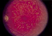 Electrophysiologic Testing In the early stages of the dystrophy, electrophysiologic testing reveals normal photopic and scotopic ERG responses. With progression of the disease, there is a moderate-to-marked loss of cone function, associated with a slight-to-moderate loss of rod function, markedly decreased or absent photopic responses and mildly decreased scotopic responses. Unusual variants with supernormal scotopic responses to suprathreshold stimuli have been described in some pedigrees.91,92 The EOGin the early stage of the dystrophy is normal. With more widespread involvement of the retina, a reduction of the light rise develops and the EOG becomes a sensitive indicator of the progress of the dystrophy. The EOG first becomes subnormal, and is then followed by the presence of a subnormal ERG. Dark adaptation curves late in the course of the dystrophy are monophasic with slightly elevated rod thresholds. Differential Diagnosis The diagnosis is based on the findings of progressive loss of central and color vision beginning in the first or second decades of life, with associated photophobia, a characteristic bull's-eye macular lesion, markedly decreased or absent photopic ERG responses, mildly decreased scotopic ERG responses, a mildly abnormal dark adaptation curve and, in the late stages, peripheral retinal pigmentary changes with retinal arteriolar attenuation. The differential diagnosis includes rod monochromatism, pericentral and sine pigmento forms of retinitis pigmentosa (rod-cone dystrophy), Stargardt's disease, central areolar choroidal dystrophy, chloroquine retinopathy, and congenital optic atrophy. Finally, certain syndromes are associated with cone dystrophies including Bardet-Biedl syndrome, Alstroms's syndrome, and Pierre-Marie ataxia with cone rod dystrophy. PERICENTRAL (INVERSE) RETINITIS PIGMENTOSA (ROD-CONE DYSTROPHY) Synonyms: Pericentral Pigmentary retinopathy, pericentral Pigmentary dystrophy, Peripapillary Pigmentaryretinal degeneration, pericentral Pigmentary degeneration Introduction Pericentral retinitis pigmentosa (rod-cone dystrophy) is characterized by pigmentary disturbances similar to those occurring in classic retinitis pigmentosa (rod-cone dystrophy), but which occur solely in the pericentral retina with no involvement of the peripheral retina.20 Grondahl94 described twenty-eight patients from four families, some demonstrating an autosomal dominant pattern of inheritance. Other previous studies from Traboulsi, O'Neill and Maumenee have reported an autosomal recessive mode of inheritance.95 Clinical Findings Vision is usually normal in the early stage and patients are often diagnosed on routine fundus examinations in the second and third decades of life. In later stages, vision may be markedly reduced to the 20/200 level or worse. Color vision is normal early on, but frequently becomes defective and may be accompanied by a progressive decrease in central vision. Nyctalopia is often present. The pigmentary changes may take the form of bone spicules or scattered black dots and are the earliest signs of the dystrophy (Fig. 5 and 6). Because the fovea is lacking in vessels, no bone spicules are present in this region. Atrophy of the retinal pigment epithelium may also be present. In contradistinction to retinitis pigmentosa (rod-cone dystrophy), the disc and retinal vessels are usually normal until late in the course of the disease.