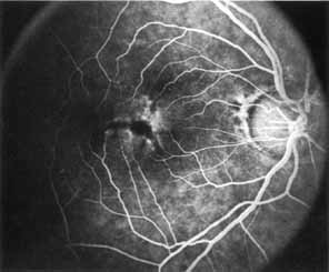 Ancillary Tests Fluorescein angiography demonstrates an ovoid area of hyperfluorescence and late staining corresponding to the RPE defect surrounding a central hypofluorescent spot related to the grayish yellow deposition material (Fig. 30). The posterior pole flecks seen in the type 2 lesions may demonstrate some hyperfluorescence and, possibly, late staining (Fig. 31).