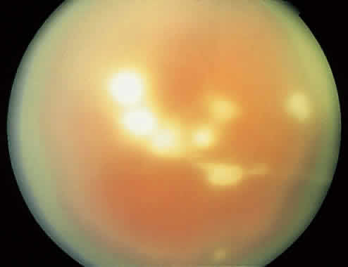 The relation between the presence of intraocular Candida infection and systemic Candida infection is important. This relation seems to vary depending on whether the patient with the Candida ocular infection is an inpatient or an outpatient. This relation has also been studied in autopsy series. In hospitalized patients, it appears that the presence of intraocular Candida infection often signifies diffuse systemic involvement. In one study,160 4 of 11 patients with Candida chorioretinitis died within 14 days of their ocular examination, and 2 of the 3 patients described by Scherer and Lee164 died before discharge from the hospital. Previous autopsy series also indicated a very high incidence of coexistent disseminated candidiasis in patients with endogenous Candida endophthalmitis. In a study by Edwards and associates,167 77% of 39 autopsy cases of endogenous Candida endophthalmitis had evidence of candidal infection in major organs. These findings are in sharp contrast to outpatients with intraocular Candida infection. In the study by Essman and associates,1 only 1 of the 16 patients with endogenous Candida intraocular infection had evidence of systemic infection. This patient had a nonhealing foot ulcer that grew Candida. All the patients in this study came to the outpatient eye clinic at an eye institute. Another outpatient series of patients with endogenous Candida endophthalmitis also demonstrated a low incidence of systemic Candida involvement.138 These outpatient cases probably result from a transient candidemia with seeding to the eye. Although the immune system often can eliminate the systemic infection when the offending nidus is removed (an indwelling venous catheter), the vitreous cavity is more isolated, and Candida organisms may continue to replicate in the eye, resulting in endophthalmitis. It is therefore important to consider Candida infection in patients with visual complaints or intraocular inflammation who are not acutely ill but may have had previous systemic risk factors or been recently discharged from a hospital. CLINICAL FINDINGS The most common presenting symptoms (Table 10) of Candida endophthalmitis are blurred vision, pain, photophobia, and ocular redness. Patients may also complain of floaters, cobwebs, or veils across their vision. Severely ill or debilitated patients may be unaware of or unable to express visual symptoms. The two most characteristic clinical signs (Table 11) are creamy white, well-circumscribed chorioretinal lesions (Fig. 6), most common in the posterior pole, and yellow or white fluffy vitreous opacities. They may be connected by strands of inflammatory material, producing what has been called a string-of-pearls appearance (Fig. 7). These focal vitreous opacities have been shown to evolve from the chorioretinal inflammatory lesions after they have broken through into the vitreous. These vitreous opacities are composed of inflammatory cells and often contain Candida organisms. Less specific posterior findings include vitritis, vasculitis, papillitis, and retinal hemorrhages. These retinal hemorrhages sometimes surround the white chorioretinal lesions, mimicking a Roth spot.1,3,12,152,153,167,168
