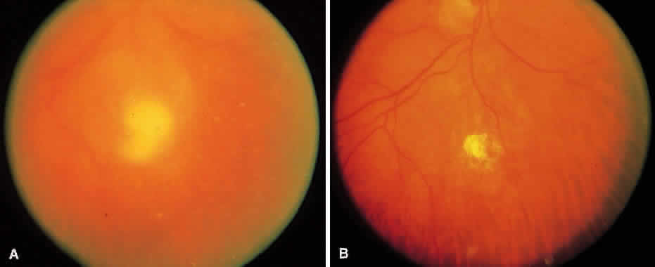 endospores can then give rise to future generations of the organism.234 The saprophytic mold fungus grows well on most routine culture media at room temperature. Definitive identification requires documenting the production of spherules at 40°C in liquid culture or in experimentally infected animals.234 The infection results from inhalation of arthroconidia. The arthroconidia are easily detached from the hyphae and released into the atmosphere. The organism is commonly found in dust. For this reason, agricultural and construction workers are particularly prone to infection. C. immitis is one of the most virulent of all fungi, and inhalation of only a few conidia in an immunocompetent host will produce infection. After exposure of the organism to the respiratory tract, the infection may result in a subclinical pneumonitis or mild to severe respiratory disease. In the immunocompetent person, it is usually self-limited and resolves in 2 to 3 weeks without significant sequelae. In unusual cases it can lead to chronic pulmonary disease and pulmonary scarring. Disseminated infection may occur in immunosuppressed patients, including AIDS patients and patients receiving steroids. The disseminated infection may result in a chronic cutaneous disease, a widespread lymphatic disease, bone involvement, visceral organ involvement, or meningitis.235–237 Coccidioidomycosis is highly endemic in the southwestern United States, northern Mexico, Central America, and several South American countries. The San Joaquin Valley is the most endemic area in the world. Since 1990, there has been a dramatic increase in cases of coccidioidomycosis documented in California. This recent increase in reported cases was related to cycles of severe aridity followed by intense rainfall. In addition, increases in construction with associated soil turnover in the area may have played a factor.238,239 DIAGNOSIS Culture of the organism from body tissues or direct identification histopathologically is the only way to make a definitive diagnosis. In addition, a skin test using extract from the saprophytic phase of the fungus may be helpful. Serologic tests, including the tube precipitin test, latex agglutination test, immunodiffusion test, and complement fixation test, may be used.234,237,240–242 OCULAR MANIFESTATIONS The first histologically proven case of endophthalmitis secondary to C. immitis was reported in 1948.243 Since then, several culture-positive and histopathologically proven cases have been reported.244–260 A prospective study found that 50% of patients with chronic pulmonary or disseminated coccidioidomycosis had ocular involvement.254 Because of this high incidence of ocular involvement, any patient with chronic pulmonary or systemic coccidioidomycosis should have a screening ocular examination. The ocular involvement can range from lid lesions to panophthalmitis. The anterior segment involvement may be extraocular and include conjunctivitis, episcleritis, scleritis, or keratoconjunctivitis. Intraocular involvement may range from a chronic granulomatous iridocyclitis to a fulminant acute anterior segment inflammatory response. Posterior segment involvement includes vitritis, choroiditis, and retinitis. There is a predilection for the peripapillary choroid to be involved, and patients may have peripheral punched-out scars similar to those seen in ocular histoplasmosis. Active choroidal lesions are often white and elevated and may involve the overlying retina. Subretinal fluid and exudate may be present. Scars may be seen in asymptomatic patients with a prior history of systemic coccidioidomycosis. In one study, 5 of 54 patients with documented systemic coccidioidomycosis had inactive peripheral chorioretinal scars.257 TREATMENT There is limited information regarding the treatment of ocular C. immitis infection.258–260 The organism usually responds to amphotericin B, although failures have occurred, both in the treatment of systemic infection and ocular infection.234,237,258–260 Intravenous miconazole has been used in cases of systemic coccidioidomycosis with ocular involvement, but the recurrence rate is high, and in one case the chorioretinitis developed while the patient was receiving the drug; in this case the infection subsequently responded to intravenous amphotericin B.255 Ketoconazole has been used in the treatment of systemic infection, but recurrence rates as high as 25% have been reported.261,262 In one study of 112 patients with nonmeningeal coccidioidomycosis, a success rate of 23% was obtained using 400 mg ketoconazole daily and 32% using 800 mg daily.262 Fluconazole and itraconazole appear to be effective for systemic coccidioidomycosis; however, their efficacy for ocular involvement is unproven.263,264 It is important to maintain a high index of suspicion for C. immitis infection in any patient with ocular inflammation of unknown etiology living in or traveling to an endemic area. This is particularly true for patients who have previous exposure to the organism. Ocular involvement has been reported as late as 22 years after primary systemic infection.258 |