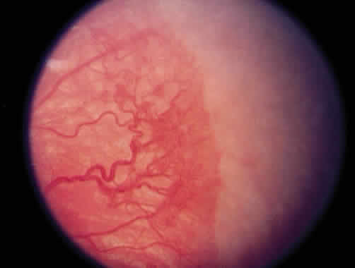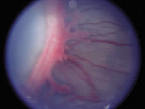 Laser is particularly useful in the management of zone I and posterior zone II disease. Most often, conjunctival incisions are necessary to get a cryotherapy probe posterior enough to treat zone I disease. This problem is obviated with laser delivery. Results of treatment of zone I disease in the Cryo-ROP Study are poor, whereas success rates of 80% to 90% have been reported in managing zone I disease with laser.71, 72, 73, 74, 75 Ridges in zone I or posterior zone II disease often are wider, with more defined vasculature than in zone II disease (Fig. 9). Zone I disease can be determined with a + 25 D lens. The disc is visualized at one rim of the lens, and avascular retina can be seen at the opposite rim when zone I disease is present (Fig. 10). A This occurs at a significant rate in the eyes of the smallest infants (500 g) with a gestation of 22 to 26 weeks. There may be an associated persistence of fetal vasculature (Fig. 11).