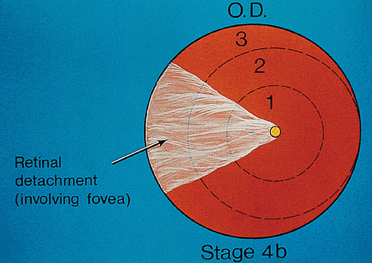 To define location, the retina was divided into three zones with the optic nerve as the center, since retinal vascular growth proceeds from the disc toward the ora serrata (Fig. 2). Zone I consists of a circle, the radius of which extends from the disc to twice the distance from the disc to the center of the macula (twice the disc-fovea distance in all directions from the optic disc). Zone II extends from the edge of zone I peripherally to a point tangential to the nasal ora serrata and around to an area near the temporal anatomic equator. Zone III is the residual temporal crescent of retina anterior to zone II. This is the zone that is vascularized last in the premature eye, and it is the zone most frequently involved with ROP. The extent of disease is specified as hours of the clock (see Fig. 2). The second parameter specified in the 1984 classification is staging of the disease, that is, the degree of abnormal vascular response observed. Four stages were recognized, and staging for the eye as a whole receives the stage of the most severe manifestation of ROP present. Stage 1 (demarcation line) is defined as a thin but definite structure that separates avascular retina anteriorly from the vascularized retina posteriorly. Abnormal branching or arcading vessels are seen leading up to the line. It is flat and white and is in the plane of the retina. Stage 2 (ridge) is present when the line of stage 1 has grown, has height and width, and occupies a volume extending up out of the plane of the retina. The ridge may be pink or white, and vessels may leave the plane of the retina to enter it. Small tufts of new vessels may be seen on the surface of the retina posterior to the ridge. These vessels do not constitute fibrovascular growth, which is a necessary condition for stage 3 ROP. Stage 3 (ridge with extraretinal fibrovascular proliferation) exists when extraretinal fibrovascular proliferation is added to the ridge of stage 2 ROP (Fig. 3). Stage 3 is arbitrarily further subdivided into mild, moderate, and severe. Stage 4 (retinal detachment) is the addition of retinal detachment to stage 3 findings. Traction or exudation cause the retinal detachment. Progressive vascular incompetence, occurring with the changes at the edge of the abnormally developing retinal vasculature, is noted by increasing dilation and tortuosity of the peripheral retinal vessels, iris vascular engorgement, pupillary rigidity, and vitreous haze. When the vascular changes are so marked that the posterior veins are enlarged and the arterioles are tortuous, a plus sign is added to the ROP stage number (Fig. 4). Subsequent to the initial ICROP report, completion of the classification of ROP led to the publication of the classification of retinal detachment.41 Stage 4 was expanded to stage 4A and 4B. Stage 4A (Fig. 5) represents extrafoveal retinal detachment, which is a concave traction type of retinal detachment in the periphery without involvement of the macula. These detachments generally are located in anterior zone II or III. Stage 4B (Fig. 6) is a partial retinal detachment including the fovea, which usually extends in the form of a fold from the disc through zone I to involve zones II and III. Stage 5 retinal detachments are total and always funnel shaped. Stage 5 is subdivided based on the shape of the funnel. The funnel is divided into anterior and posterior parts, allowing for four subdivisions, depending on whether the funnel is open or narrow in both parts of the funnel. Although regression was not part of the classification, the committee recognizes that it is the most common outcome of ROP. The various patterns of regression were believed to be too numerous to classify; they are listed in (Table 1).