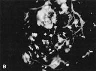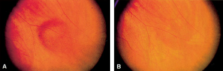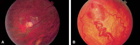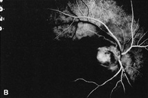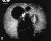 is no gender preference. These lesions may be more common in whites.33 The association between these retinal vascular tumors and hemangiomatous cysts of the cerebellum was first recognized in 1926 by Lindau, and this association is referred to as von Hippel-Lindau disease.74 von Hippel-Lindau disease is defined as the combination of one or more capillary hemangiomas of the retina in association with a cerebellar hemangioblastoma. This is an autosomal dominant phakomatosis with variable penetrance.43 Many cases occur as a spontaneous mutation, and thus the family history is positive in only approximately 20% of affected persons.43 Lindau estimated that 25% of all patients with retinal lesions have or develop an intracranial mass.74 Other systemic findings associated with von Hippel-Lindau syndrome include pheochromocytoma, renal cell carcinoma (which is the most common cause of death in these patients), and ovarian, pancreatic, and epididymal cysts.43,75,76 Retinal capillary hemangioma is the first manifestation in approximately 50% of these patients.77 When von Hippel-Lindau disease is suspected, systemic workup should include either a MRI or CT scan of the brain with attention to the posterior fossa. An abdominal CT scan and laboratory analysis for the presence of a pheochromocytoma also should be performed.75 When the family history is positive, affected patients require lifelong medical evaluations by an internist, since the protean systemic manifestations can develop years after the retinal tumors are noted.77 The gene for von Hippel-Lindau disease has been localized at 3p25-26, and genetic testing is available for affected patients.78 Retinal capillary hemangiomas also have been reported in neurofibromatosis and Marshall-Stickler syndrome.79,80 Clinically, retinal capillary hemangiomas are smooth, oval, pink or red intraretinal masses (Fig. 9A). Gliosis and retinal pigmentary changes can occur on the lesion surface to alter this appearance.75 Retinal hemorrhage and exudate often surround the tumors. When fully developed, retinal capillary hemangiomas are fed by markedly dilated, often beaded, and tortuous arteries and are drained by similarly appearing veins (see Fig. 9B). When the lesions are small, however, the feeding and draining vessels may not appear abnormal.73 The tumors are typically between 1 and 5 mm, although larger lesions measuring 10 mm have been reported.75 The lesions can occur anywhere in the fundus but are most frequently seen in the temporal equatorial region and on the optic nerve73,75 (Fig. 10A). They are multiple in approximately one third of affected eyes and bilateral in approximately one half of affected persons.73,75,81 Growth of preexisting lesions, as well as development of new retinal capillary hemangiomas in previously uninvolved retina, has been documented. Unusual retinal vascular hamartomas other than retinal angiomas have been detected in patients with von Hippel-Lindau disease and their relatives.82 IVFA demonstrates rapid dye transit through the tumor with profuse leakage of fluorescein during the recirculation phase (see Fig. 10B). Pathologic study of the retinal capillary hemangioma lesions demonstrates thin-walled capillaries surrounded by stromal cells.83 The blood-filled spaces tend to be small.81 The usual age of presentation for a patient with a retinal capillary hemangioma is the second or third decade of life. On occasion, asymptomatic lesions are noted on routine examination. Loss of vision usually occurs when the capillaries associated with the tumor become incompetent and exudate extends into the macula. Even small, peripheral retinal capillary hemangiomas can produce remote exudation into the fovea.75 If these hemangiomas are not treated, total exudative retinal detachment can ensue with secondary iris neovascularization and neo-vascular glaucoma. Epiretinal membranes, vitreous hemorrhage, retinal neovascularization, and both fractional and rhegmatogenous retinal detachments also can occur.84,85 The clinical appearance of retinal capillary hemangiomas located at the optic nerve varies considerably from that of capillary hemangiomas of the retinal periphery. The optic nerve lesions have been described in three varieties.86 The most easily recognized type is the endophytic, which grows anteriorly into the vitreous cavity. It is similar in color and appearance to the peripheral retinal lesions while lacking abnormally dilated feeding and draining vessels (see Fig. 10A). The sessile and exophytic types grow toward the subretinal space and also lack large feeding and draining retinal vessels. The latter two varieties can be difficult to differentiate from peripapillary CNV, choroiditis, choroidal hemangiomas, or optic nerve edema. Stereoscopic IVFA may help to differentiate these entities.86 Clinically, sessile hemangiomas appear as flat, ill-defined, yellow-orange lesions visible underneath grayish, thickened overlying retina. The endophytic type is similar in appearance but has a nodular growth pattern. Visual loss occurs secondary to serous or exudative fluid that extends into the macula, often with hard exudate, Rarely does the serous retinal detachment become as severe as with peripheral retinal capillary hemangiomas. Optic disc and retinal capillary hemangiomas can occur in the same eye together, or a patient can have a disc hemangioma in one eye with a retinal hemangioma in the other. Bilateral optic disc capillary hemangiomas have been described.87 Retinal capillary hemangioma can simulate congenital retinal telangiectasis with exudative detachment (Coats' disease). The lack of either “light bulb” telangiectasis or peripheral retinal capillary nonperfusion on IVFA, coupled with the presence of feeding and draining vessels leading to a retinal mass, usually reveals the proper diagnosis. Other entities in the differential diagnosis are grade III arteriovenous communications and cavernous hemangiomas of the retina. Based on the n