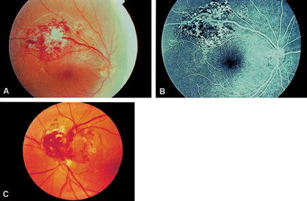 and in the peripheral fundus.131 Visual loss may result from subretinal hemorrhage, vitreous hemorrhage, or