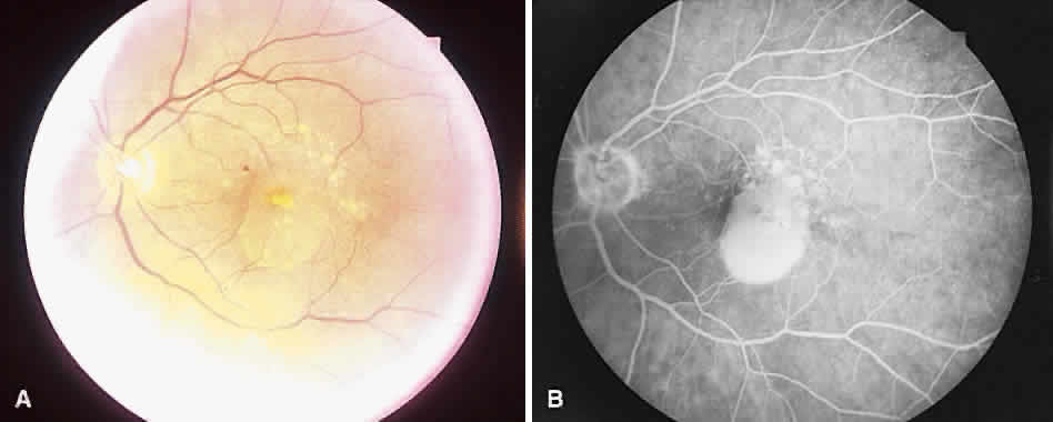 findings and natural course. Gass and Oyakawa196 originally proposed the classification in 1982, and Gass and Blodi197 revised it in 1993. Secondary causes of juxtafoveal telangiectasis include retinal venous obstruction, macroaneurysms, diabetes, radiation retinopathy, carotid occlusive disease, sickle retinopathy, retinal hemangiomas, retinal astrocytoma, intraocular inflammation, Eales disease, and tapetoretinal degenerations.197 These should be excluded to classify a patient as having IJRT. It has been suggested that patients with juxtafoveal telangiectasis be tested specifically for diabetes, because patients with early background diabetic retinopathy may have changes very similar to IJRT. The ophthalmoscopic appearance varies between the subsets of IJRT. Table 3 summarizes the features of the different groups. Group 1A patients are usually male with unilateral involvement. Most are white. The area of involvement is located temporal to the fovea and is often more than 2 disc diameters and straddles the horizontal raphe. There is vascular compromise of the telangiectatic vessels with exudate and retinal edema. Gass believed that this is developmental and in the spectrum of Coats syndrome. Loss of vision is due to exudate into the fovea and macular edema, often with cystoid change. Laser photocoagulation to prevent accumulation of lipid in the fovea is helpful. Spontaneous resolution of the edema with improvement in vision can occur over many years. Close to half of these patients have peripheral telangiectasis.198 Group 1B patients are similar except that the involved area is smaller (Figs. 25 and 26). Laser treatment is effective for macular edema and exudates.
