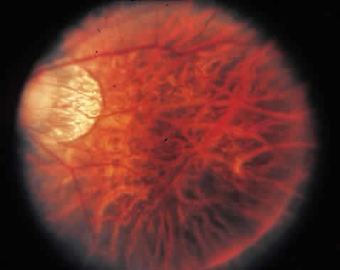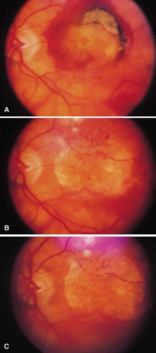 HISTOPLASMOSIS The presumed ocular histoplasmosis syndrome is a major cause of visual impairment in the central and eastern United States, especially in the Ohio and Mississippi River valleys. Histoplasma capsulatum is a dimorphic soil fungus that is acquired through the respiratory tract and usually results in an asymptomatic, self-limited infection, but it can develop into a disseminated infection in immunocompromised persons.100,101 Presumed ocular histoplasmosis syndrome has been clinically linked to H. capsulatum, even though organisms are usually not found in autopsied eyes of patients known to have the disorder. The triad of ocular findings in histoplasmosis comprises peripheral, punched-out, atrophic choroidal lesions; peripapillary choroidal scars; and macular lesions with or without SRNV. The peripapillary disc scarring consists of choroidal and RPE atrophy, with a line of pigment at the disc margin of the scar, as opposed to some normal eyes with optic nerve crescents that have pigment at the outer border of the scar. The active lesion of histoplasmosis is a small round area of choroiditis that can create a small overlying sensory retinal detachment. This picture can be difficult to differentiate from active SRNV. The areas of active choroiditis are not associated with vitreous cells. The lesions become quiet and create atrophic, and later pigmented, scars called histo spots, which appear symptomatically during the patient's lifetime. SRNV may be associated with a previous area of histoplasmosis scarring (Fig. 15). The visual prognosis is poorer for eyes with SRNV and a perifoveal choroidal scar in the fellow eye. If such a scar exists, there is a 20% to 25% chance of the development of a neovascular membrane in 5 years; without such scars, there is only about a 4% chance of SRNV developing from the scarring around the disc.102,103 A follow-up evaluation of patients in the MPS showed that choroidal neovascularization is often preceded by an atypical histo spot.104 Macular SRNV, however, has been described in the absence of preceding atrophic scars.105 Prognosis for vision remains good: 81% can be expected to have 20/20 or better acuity after 5 years when the fellow eye has had CNV.104 Laser treatment has been shown to be an effective treatment of SRNV associated with presumed ocular histoplasmosis syndrome and located 200 μm or more from the center of the foveal avascular zone.106 In the ocular histoplasmosis section of the MPS, 34% of untreated eyes versus 9% of treated eyes suffered severe visual loss of six or more lines after 18 months of follow-up. Corticosteroids are not believed to be of benefit for the associated SRNV. Subretinal surgery for the removal of subfoveal CNV has been performed in ocular histoplasmosis. Berger and colleagues107 reported that acuity improved by two lines in 35%, was unchanged in 44%, and worsened in 21%. Recurrence of the subfoveal CNV occurred in 38% and was more common in eyes that had undergone preoperative laser photocoagulation. The median time to recurrence was 5 months. Perfusion of the subfoveal choriocapillaris may have implications for visual improvement after subfoveal surgery.108 If subfoveal membranes have an extrafoveal ingrowth site, the prognosis is better for visual recovery as opposed to a subfoveal or unidentifiable ingrowth site.109 Melberg and colleagues110 studied recurrences and found that recurrent lesions were extrafoveal in 16%, juxtafoveal in 18%, and subfoveal in 66%. These eyes were treated with laser photocoagulation, further subfoveal surgery, or observation. Eyes amenable to laser did better in terms of vision. The differential diagnosis of presumed ocular histoplasmosis syndrome includes a group of diseases of unknown cause that create multifocal choroidal scarring and are known variously as recurrent multifocal choroiditis, punctate inner choroidopathy, multifocal choroiditis with progressive subretinal fibrosis, and pseudohistoplasmosis.111–114 Many patients who have these diagnoses also have associated vitreous inflammation, and the pattern of scarring changes with time more than in presumed ocular histoplasmosis syndrome. MYOPIA Degenerative, or pathologic, myopia is one of the leading causes of blindness in the world.115 The chorioretinal lesions that accompany myopia have been attributed either to progressive axial elongation or to a genetically determined atrophic process independent of anatomic eye wall changes.116–118 The myopic disc is oval, with a long vertical axis, and may appear tilted or oblique; it often has a temporal concentric area of depigmentation, called a temporal crescent. Posterior pole staphyloma may be present early in life, and its incidence increases with age.119 The sensory retina, RPE, and choroid are thinned, and the underlying choroidal vessels are prominent (Fig. 16). Chorioretinal atrophy may be extensive and may appear as round or irregular yellow-white areas with focal deposits of pigment.
