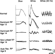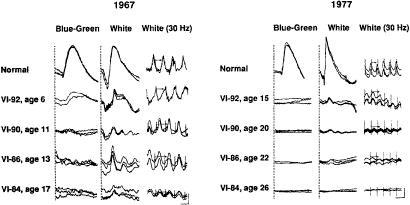ELECTRORETINOGRAMS In 1945 Karpe35 reported that patients with advanced retinitis pigmentosa have very small or nondetectable (less than 10 μV) electroretinograms (ERGs). Subsequently it has been shown that patients with early retinitis pigmentosa can have reduced but easily detectable ERG responses.36–39 Responses are not only reduced in size but are also delayed with respect to the time interval between stimulus flash onset and corresponding response peaks (i.e., b-wave implicit time).38–42 These ERG changes can be detected in some instances many years before diagnostic abnormalities are visible on fundus examination.41 Figure 2 illustrates representative full-field ERGs from a normal subject and four children with early retinitis pigmentosa. Rod responses to single 0.5-Hz flashes of blue light (left column) are reduced and, when detectable, are delayed in b-wave implicit times. Cone responses to 30-Hz white flickering light (right column) are normal or reduced in amplitude and normal or delayed in b-wave implicit times. In most cases, cone b-wave implicit times are so delayed that a phase shift occurs between the stimulus flash onset (designated by the vertical lines) and the corresponding response peaks; each stimulus flash elicits the next-plus-one response in contrast to the normal. In mixed cone-rod responses to single 0.5-Hz flashes of white light (middle column), the cornea-negative a-wave generated by the photoreceptors is reduced in amplitude in all genetic types; this reflects the early involvement of the photoreceptors in this group of diseases.41 The reduced and delayed ERGs recorded from patients with widespread progressive forms of retinitis pigmentosa contrast with the reduced ERGs with normal b-wave implicit times observed in patients with self-limited sector retinitis pigmentosa. Figure 3 shows full-field ERGs from a father and son with dominantly inherited sector retinitis pigmentosa separated in age by almost 30 years; they have comparably reduced ERGs with normal b-wave implicit times. Patients with sector retinitis pigmentosa usually have patches of intraretinal pigment that are confined to one or two quadrants of the periphery of each fundus, with loss of peripheral rods and cones and consequent reductions in both rod and cone full-field ERG amplitudes. ERGs recorded from patients with sector retinitis pigmentosa are comparable to those recorded from patients who have large chorioretinal scars in the periphery.41 Full-field ERG testing can be used not only to identify which patients have widespread progressive forms of retinitis pigmentosa but also to determine which relatives are normal. Relatives of patients with retinitis pigmentosa, age 6 or older, with normal rod and cone ERG amplitudes and implicit times have not been observed to develop widespread progressive forms of retinitis pigmentosa at a later time.41–43 CARRIERS OF X-LINKED RETINITIS PIGMENTOSA Females with the carrier state of X-linked retinitis pigmentosa can present with an area of bone spicule pigmentation in the periphery or an abnormal tapetal reflex in the macula. Less than 50% of carriers of child-bearing age show diagnostic findings on ophthalmoscopic examination, whereas more than 90% have abnormal ERGs.44 Abnormal ERGs in obligate carriers are either reduced in amplitude or delayed in cone b-wave implicit time, or both, in one or both eyes44,45 (Fig. 4). Daughters of obligate carriers can have either normal ERGs or abnormal ERGs similar to those recorded from obligate carriers.44 Female carriers of X-linked retinitis pigmentosa can have a slowly progressive retinal degeneration, although the natural course remains to be defined. Some female carriers have had considerable loss of visual field and substantial reductions in ERG amplitudes by age 70.44 The abnormal ERGs of female carriers of X-linked retinitis pigmentosa contrast with the normal full-field ERG amplitudes and normal fundi observed in obligate female carriers of autosomal recessive disease.44 Carriers of X-linked retinitis pigmentosa have a 50% chance of having an affected son and a 50% chance of having a carrier daughter with each childbirth. NATURAL COURSE The ERG provides a quantitative measure of remaining retinal function in patients with retinitis pigmentosa. Figure 5 illustrates ERGs from affected patients followed over a 10-year period; responses become smaller as the condition progresses. Responses less than 10 μV are nondetectable with conventional recording techniques (i.e., without signal averaging). Patients with nondetectable conventional ERGs can still retain considerable visual function because most are not legally blind until ERG amplitudes decline to 0.05 μV or less. Signal averaging with a bipolar artifact reject buffer and narrow-bandpass