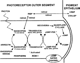 be recorded that are as low as 1 μV to 0.5-Hz flashes of white light (normal Among 94 patients, ages 6 to 49 years, with the common forms of retinitis pigmentosa, full-field ERGs declined significantly over a 3-year interval in 66 of 86 patients (77%), with detectable responses at baseline. Patients lost on average 16% of remaining full-field ERG amplitude per year to single flashes of white light (95% confidence limits, 13.1% to 18.6%) and 18.5% of remaining amplitude per year to 30-Hz white flicker (95% confidence limits, 15.1% to 21.5%). Patients lost on average 5.2% of remaining foveal cone ERG amplitude per year, indicating that loss of retinal function was primarily extrafoveal in these patients. They lost on average 4.6% of remaining visual field area per year in the Goldmann perimeter with a V-4e white test light, whereas visual acuity and dark-adaptation thresholds remained relatively stable. Bone spicule pigment increased in 54% for whom comparisons could be make over a 3-year interval, suggesting that observation of increased pigmentation as a means of following this condition is not as sensitive as full-field ERG testing.46 Caution must be exercised in applying these population ERG results to predict longitudinal patterns in individual patients, because standard deviations derived from standard errors have revealed considerable variation around the mean for these patients.46 However, these results, describing the natural course on a quantitative basis, provide a frame of reference for planning interventions in similar populations to stabilize or slow the course of retinitis pigmentosa, particularly if monitored with full-field ERG testing. MOLECULAR GENETIC STUDIES Substantial genetic heterogeneity exists among patients with retinitis pigmentosa with abnormalities in over 25 genes identified as of 2001; an updated list is maintained on the RetNet site (http://www.sph.uth.tmc.edu/Retnet/sum-dis.htm). Genes so far identified as causes of nonsyndromic retinitis pigmentosa, as well as Usher syndrome, are given in Table 2.48–87 Molecular genetic analyses have revealed defects in genes encoding proteins involved in the phototransduction cascade (Fig. 7), the retinoid cycle (Fig. 8), and structural components of photoreceptors, as well as in photoreceptor and retinal pigment epithelial proteins with unknown functions.