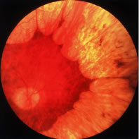 remains to be established. Patients who present with a widespread loss of photoreceptor function with abnormal ERGs and symptoms of cerebral deterioration may have a cerebroretinal degeneration, grouped under the overall heading of neuronal-ceroid lipofuscinosis, or Batten disease. These diseases, which are recessively inherited, are characterized by accumulation of lipopigments (lipofuscin and ceroid) in neurons and other cell types. Batten disease can be subdivided into an infantile form (psychomotor deterioration by age 2, ataxia, microcephaly, granular inclusions on conjunctival biopsy), a late-infantile form (seizures, rapid mental deterioration in early childhood, curvilinear inclusions on conjunctival biopsy), a juvenile form (mental deterioration beginning around age 6, bull's eye maculopathy, fingerprint inclusions on conjunctival biopsy), and an adult-onset form (seizures, slow dementia, abnormal inclusions best seen on muscle biopsy). Molecular genetic studies have revealed that the juvenile onset form of Batten disease results from defects in the CLN3 gene on chromosome 16p; most patients have a 1.2 kb deletion in this gene on at least one chromosome.239 The gene encodes a novel protein of unknown function. The mechanism of apoptosis appears to be involved in the demise of both cerebral neurons and photoreceptors.240 No treatment exists for the retinal degeneration associated with this condition. Patients with olivopontocerebellar atrophy (more recently designated as SCA7, a form of spinocerebellar ataxia) can present with a history of tremors, ataxia, and dysarthria and show findings of oculomotor impairment and retinal degeneration. This condition is inherited by a dominant mode with variable penetrance. Some patients have retinal arteriolar attenuation, a diffuse disturbance of the RPE, and very reduced ERGs. Some patients may show only neurologic findings and have normal fundi and normal retinal function, whereas others have had abnormal ERGs with no diagnostic findings on fundus examination and no history of neurologic disease.241,242 Patients with this condition have been found to have expansions of CAG trinucleotide repeats on DNA analysis.243 Other rare syndromes associated with retinal degeneration include Alström disease and Cockayne syndrome. Patients with Alström disease have retinitis pigmentosa with profound loss of vision in the first decade and very reduced ERGs. Systemic findings include diabetes mellitus, obesity, deafness, renal failure, baldness, and hypogenitalism.244,245 Patients with Cockayne syndrome show extensive loss of vision by the second decade and have retinitis pigmentosa, dwarfism, deafness, mental deterioration, and premature aging.246 No treatments are known for these conditions. |