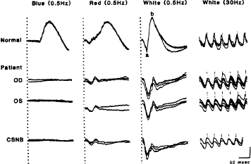 stages of retinitis pigmentosa. The previous classification of these diseases was based on the family of origin (e.g., Nougaret type), by the original description of the ERG waveforms associated with the condition (e.g., Riggs type or Schubert-Bornschein), or by the ophthalmologist who first described the disease (e.g., Oguchi disease). These diseases are now being reclassified by molecular genetic analysis.247 Missense mutations in three different genes encoding members of the rod phototransduction cascade have been reported to cause dominantly inherited stationary night blindness. Specifically, the mutations are the Ala292Glu and Gly90Asp mutations in rhodopsin,248,249 the His258Asp mutation in the β-subunit of rod phosphodiesterase,250 and the Gly38Asp mutation in the α-subunit of rod transducin.251 The latter mutation has only been seen in the descendants of Jean Nougaret. Although the Ala292Gly rhodopsin mutation apparently causes a complete loss of rod function (i.e., Riggs type),248 the other mutations cause an incomplete loss of rod function.251,252 Some evidence exists from psychophysical and ERG testing that the rods are constitutively active in the dark in some forms of stationary night blindness. This has been suggested for patients with the rhodopsin, Gly90Asp mutation.249 The ERG abnormalities in patients with the Gly38Asp mutation in the α-subunit of rod transducin can be simulated by light adapting the normal retina, compatible with the idea that these patients have mutant rod transducin that is constitutively active in the dark.252 Further evidence that these patients have rod photoreceptors despite their night blindness is provided by fundus reflectometry studies that have shown normal levels of rhodopsin and normal rhodopsin kinetics.253 Oguchi disease is a recessively inherited form of stationary night blindness. Following 1 hour of dark adaptation, patients with Oguchi disease have no rod b-wave in response to dim blue light flashes, a cornea-negative response to white light, and a normal cone response to 30-Hz white flicker. Following complete dark adaptation after 12 hours, some patients have a normal rod b-wave amplitude and normal rod b-wave implicit time but only in response to one or two flashes of light.254 Apparently the test flash used to elicit the ERG, although relatively dim, can be intense enough to light adapt the rod system. Molecular genetic analyses have shown a null mutation, Asn309(1-bp del), in the gene encoding arrestin in some patients of Japanese descent.255 Several null mutations have also been described in the gene encoding rhodopsin kinase in some patients of Eastern European descent.256 Both arrestin and rhodopsin kinase participate in the deactivation of photoactivated rhodopsin. The lack of either arrestin or rhodopsin kinase would be expected to have the same physiologic effect, namely the prolongation of photoactivated rhodopsin with a consequent abnormality in rod sensitivity. Fundus albipunctatus is another form of recessively inherited stationary night blindness.257,258 Patients with fundus albipunctatus have a delay in rod visual pigment and foveal cone pigment regeneration, as monitored with fundus reflectometry.257 Changes in visual pigment levels parallel the prolonged cone and rod limbs of the dark-adaptation curve. Full-field ERGs have been found to be normal with respect to both cone and rod amplitudes and b-wave implicit times after full dark adaptation.258 The findings in fundus albipunctatus suggest an abnormality in visual pigment regeneration secondary to some abnormality in the relationship between the photoreceptors and the pigment epithelium. The composition of the yellow-white lesions and their relationship to the abnormality in visual pigment regeneration are not known. Patients with this condition have been observed to have defects in the gene encoding 11-cis retinol dehydrogenase.259 A form of stationary night blindness for which the precise gene defect remains unknown is congenital nyctalopia with myopia. This condition (i.e., Schubert-Bornschein type) is inherited by either an X-linked or autosomal recessive mode.260–262 The extent of the myopia is characteristically -3.5 to -14.5 diopters (D). Patients cannot attain normal dark-adapted rod thresholds and have fundus findings of myopia. Their rod ERG b-wave responses to dim blue light are nondetectable, and the patients have a characteristic cornea-negative response to white light in the dark-adapted state and normal or nearly normal cone responses to 30-Hz white flicker. The preservation of the a-wave from the rod photoreceptors with loss of the b-wave from neurons proximal to the photoreceptors suggests some abnormality in intraretinal transmission of the response from the rod photoreceptors to proximal retinal cells. ERG amplitudes are reduced in congenital nyctalopia with myopia compared with those from normal emmetropes; this probably occurs because of the known reductions of ERG amplitude seen in patients with moderate axial myopia as the only finding.263 The ERG abnormality in congenital nyctalopia with myopia has been reported as an acquired defect in patients with cutaneous malignant melanoma, who have an acute onset of night blindness with selective reduction in the rod b-wave response264 (Fig. 18). Development of an antibody to the melanoma that also reacts to retinal cells with an interruption in rod signal transmission has been considered as a probable mechanism to account for the sudden onset of night blindness in patients with this paraneoplastic retinopathy. Patients with congenital nyctalopia have been further subdivided into two groups designated as the complete or incomplete form of the condition based on dark-adaptation measures and ERG amplitudes. In the complete form, the rod a-wave is normal, whereas the rod b-wave is absent and responses are mediated by the cone system. In the incomplete form, rod ERG responses, although reduced in am
