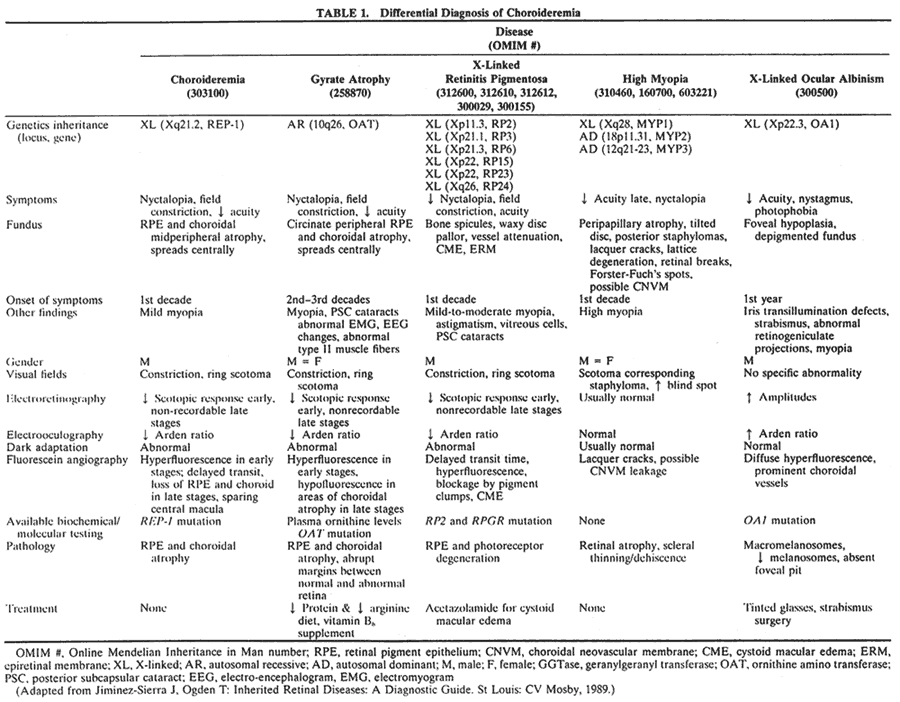 syndrome type II locus on the distal part of chromosome 1q. Hum Mol Genet 1:71, 1992 33. Cremers FP, Armstrong SA, Seabra MC et al: REP-2, a Rab escort protein encoded by the choroideremia-like gene.J Biol Chem 269:2111, 1994 34. Fraser B, Friedmann A: Choroideremia in a female. BMJ 2:732, 1968 35. Harris G, Miller J: Choroideremia: Visual defects in a heterozygote. Arch Ophthalmol 80:423, 1968 36. Burke M, Choromokos E, Bibler L et al: Choroideremia in a genotypically normal female: A case report. Ophthalmic Pediatr Genet 6:163, 1985 37. Francois J: Importance of electrophysiology in ophthalmogenetics. Ophthalmologica 188:14, 1984 38. Cheng C, Chen M, Hou P: Choroideremia: A study of two families. J Formos Med Assoc 90:1103, 1991 39. Pinckers A, van Aarem A, Brink H: The electrooculogram in heterozygote carriers of Usher syndrome, retinitis