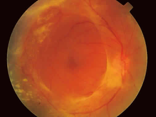 LONG-STANDING Progressive atrophy of all retinal layers occurs if the retina remains detached.88 A chronically detached retina takes on a smooth contour and becomes semitransparent. In some cases, cystic spaces develop in the detached retina. Atrophy and depigmentation of the underlying RPE also develop in these eyes.28 When an RRD remains static for 3 months or more, RPE metaplasia may occur at the border of the detachment. Ophthalmoscopically, this corresponds to either a pigmented or depigmented demarcation line. Most RRDs that are surrounded by a demarcation line eventually progress; nonetheless, surgical repair of these eyes has an excellent prognosis (Fig. 11).94