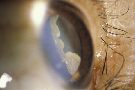 In injuries severe enough to cause a full-thickness corneal rupture, the wound usually crosses the limbus into the adjacent sclera. Exceptions are eyes that have had radial keratotomy, cataract surgery, or corneal transplantation, even years before the trauma.36–38 GLAUCOMA Acutely, the intraocular pressure may be normal, increased, or decreased. Aqueous outflow may be decreased because of angle recession, inflammatory trabeculitis, or hyphema. On the other hand, ciliary body injury tends to decrease aqueous inflow. The intraocular pressure depends on the balance of these factors. In patients who have large hyphemas, the pressure may rise abruptly. Therefore, it must be checked at regular intervals. It is especially important to monitor the intraocular pressure in hyphema patients who have sickle cell disease, be it homozygous or heterozygous. Unlike normal erythrocytes, sickled erythrocytes cannot pass through the trabecular meshwork and tend to occlude it, raising intraocular pressure. This, in turn, can cause central retinal artery obstruction even if the pressure is only in the high twenties or low thirties. Prompt paracentesis followed by surgical evacuation can restore vision.39 Late glaucoma can also develop, even years after the initial injury. Autopsy studies have found three ways by which the trabecular meshwork can be obstructed: proliferation of corneal endothelial cells and Descemet's membrane, proliferation of fibroblasts, and peripheral anterior synechiae (presumably from inflammation or from organization of blood in the angle for more than 7 days).40 Other possibilities are direct damage to the trabecular meshwork and damage to the ciliary muscle with reduced traction on the scleral spur. The risk is greatest in patients who have severe anterior segment damage such as cataract, angle recession, iris damage and displacement of the lens.41 Nine percent of patients with angle recession develop permanent glaucoma.42 If trabeculectomy is required, some authors recommend antimetabolites because the failure rate in patients with angle recession is greater than it is in patients with typical open angle glaucoma.43 LENS When the lens is struck by the cornea or by a strong shock wave, a transient anterior subcapsular cataract, known as a rosette cataract, may develop (Fig. 6). Repeated trauma, as in boxers, often causes posterior subcapsular cataract. Blunt trauma can also result in rupture of the anterior or posterior capsule.44,45 In severe cases, iridodonesis or a bead of vitreous in the anterior chamber signals a subluxed lens. Dislocation may also occur (Fig. 7). It is important to remember that ocular trauma is common, but lens dislocation is rare. Therefore, in patients with a dislocated lens, the clinician should always rule out predisposing causes such as Marfan's syndrome, homocystinuria and syphilis. In rare cases the lens itself can rupture and cause phacolytic glaucoma.