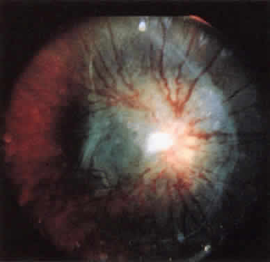 are mentally retarded. The majority of patients with SWS have sporadic, nonfamilial disease. Only a few familial clusters of the syndrome have ever been reported, and most of those have not exhibited the clear-cut autosomal dominant inheritance pattern of the three classic syndromes. The incidence of the complete syndrome and its formes frustes is unknown. The classic cutaneous feature of SWS is the facial nevus flammeus, a flat to moderately thick zone of dilated telangiectatic cutaneous capillaries lined by a single layer of endothelial cells in the dermis.43 The lesion is usually unilateral and most frequently involves the regions of the face innervated by the first, occasionally the first and second, and rarely all three branches of the trigeminal nerve. The ipsilateral nasal mucosa, buccal mucosa, and conjunctiva are also involved in some patients, and localized hypertrophy of the involved tissues may be present. The classic ophthalmoscopic feature of SWS is the diffuse choroidal hemangioma, a generalized hemangiomatous thickening of the choroid that tends to be most pronounced near or around the optic disc and in the macula.44 The involved fundus tends to have a more saturated red appearance than the contralateral fundus. The optic disc frequently exhibits deep central cupping, which is due in large part to the thickening of the circumpapillary choroid. In some patients, the retinal blood vessels in the affected eye are dilated and tortuous.43 Accentuated regions of hemangiomatous choroidal thickening are evident in some eyes. Other ocular abnormalities that have been described in patients with SWS include telangiectasia of the conjunctiva and episclera. There are three principal mechanisms of progressive visual loss in the affected eye of patients with SWS: glaucoma, cystic degeneration of the macular retina, and nonrhegmatogenous retinal detachment. The glaucoma tends to occur early in life and be resistant to conventional forms of treatment.45 The underlying bases for the glaucoma in SWS appear to be anomalous angle development and elevated episcleral venous pressure. The cystic macular retinal degeneration that occurs in some affected eyes develops over the course of years in eyes with pronounced thickness of the choroidal hemangioma in the macula.44 The exudative retinal detachment that occurs in some eyes usually develops during the second to fourth decades of life. The detachment tends to become chronic and can become total and bullous, with displacement of the detached retina up against the back surface of the lens in severe cases.46 If glaucoma develops as part of SWS, medical therapy is sometimes able to control the intraocular pressure and limit or retard visual field impairment. In many patients, however, a filtering procedure or even a cyclodestructive procedure is needed to control the glaucoma.45 If an exudative bullous retinal detachment develops, then low-dose external beam radiation therapy (approximately 12–20 Gy in a fractionated schedule) appears to be the most appropriate therapy.46 This treatment generally stimulates complete reabsorption of the subretinal fluid within about 3 months and prevents fluid reabsorption. Unfortunately, the visual prognosis of such eyes is very poor even if the retina becomes fully reattached. No treatment has been found to be helpful in preventing or reversing the cystic retinal degeneration that tends to occur in the macula of some eyes. If seizures are a feature of the syndrome, medical therapy is usually required. |