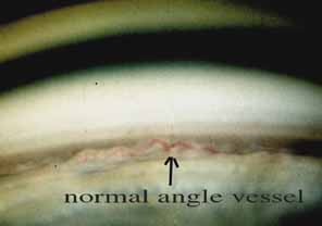 Angle Vessels There are certain features that differentiate normal from abnormal angle vessels. Normal angle vessels rarely bridge the scleral spur and do not branch. They are usually single vessels without arborization (Fig. 4). Normal angle vessels are seen in 62% of individuals with blue eyes and only 9% with brown eyes.8 Iris Processes Iris processes (Fig. 5) may be confused with peripheral anterior synechiae. Iris processes are most common nasally and gradually diminish with increasing age.9 Schlemm's Canal The canal (Fig. 6) is located directly anterior to the scleral spur and is normally not seen. However, during gonioscopy, blood may reflux in to the canal exposing its dimensions. The canal is approximately 300 μm in width, 36 mm in length, and 30 μm in height. Angle Pigmentation A minimal amount of angle pigment is expected but excessive angle pigmentation should prompt the examiner to search for its cause (Fig. 7). This may be caused by pigmentary glaucoma, pseudoexfoliation, trauma, uveitis, or tumors.