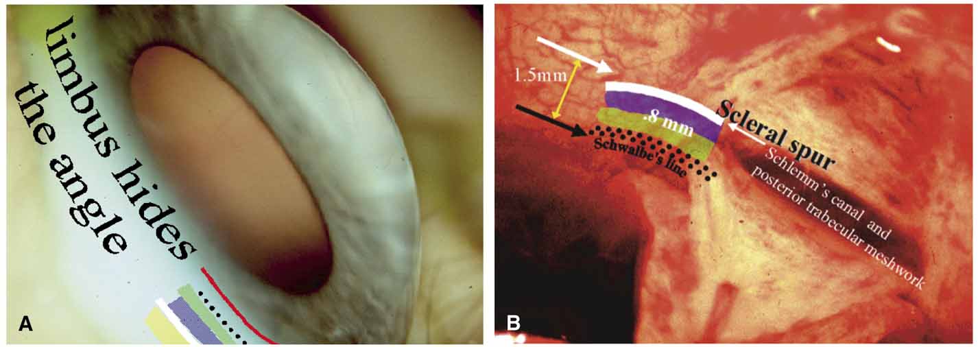 Many ophthalmologists use the van Herick17 test to estimate depth of the peripheral anterior chamber (Table 2). It is a screening tool designed to estimate depth of the iridocorneal angle but not a substitute for gonioscopy.18 A thorough understanding and review of limbal anatomy reveals why the van Herick test is not always what it seems. Surgeons who perform angle surgery realize the immense variability of the region surrounding the scleral spur (Fig. 9).