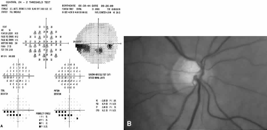 | Despite control of intraocular pressure, many eyes with glaucoma exhibit progression of visual field defects over time. Most eyes exhibit an increase in the density of the scotoma, and approximately 50% exhibit an increase in scotoma size or the appearance of a new scotoma.15 Progression of defects may occur in episodic bursts intermixed with stable periods of varying duration. If only one hemifield is involved, the defects remain localized to that hemifield for extended periods in 60% to 75% of eyes. Progression often occurs more rapidly when both hemifields are involved.12 The mean level of intra-ocular pressure does not differentiate glaucoma patients with progressive visual field loss from ones who remained stable.16 |