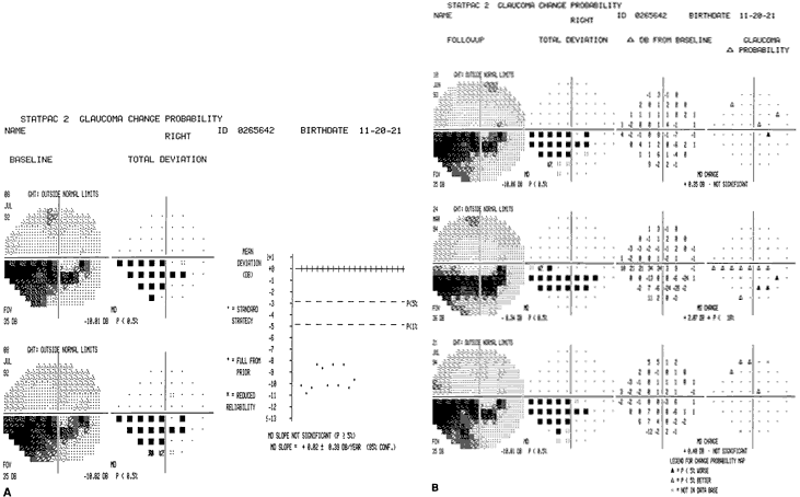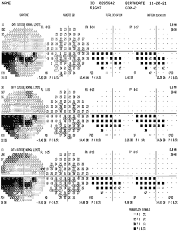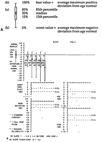 NUMERIC PRINTOUTS Even if a sophisticated data analysis program is used, one should always inspect the numeric printout. Gray scales provide only a semiquantitative assessment of the visual field, with interpolated values printed between tested points, and they are insufficient for full analysis. Most programs present numeric data in two forms: the actual thresholds plot and the difference plot. The actual thresholds plot shows the differential light sensitivity at each location measured. The numbers in the difference plot represent the difference between the measured threshold and the age-corrected normal value for each point in the visual field. Statistically, a few isolated points that deviate more than 4 dB from values for age-matched controls can occur in a normal visual field without necessarily indicating an abnormality. A defect is more likely to represent an abnormality when a large number of contiguous points are involved, the depression is dense, and the defect is reproducible on subsequent perimetry. Defects are more likely to represent a glaucomatous abnormality if they fit into a known nerve fiber bundle pattern. Points at the edge of the test area (rim points) may be abnormal in otherwise normal visual fields and may not indicate glaucomatous damage. Testing of the peripheral visual field may allow one to differentiate a peripheral artifact from a true visual field defect. The difference plot detects deviations from age-matched controls, but they occasionally may miss early subtle defects, particularly if the baseline retinal sensitivities for a patient are greater than average. Therefore, raw threshold plots should be scrutinized for shallow defects by looking for small clusters of points that are surrounded by points of higher thresholds. Particular attention should be given to the paracentral and nasal step regions. PROBABILITY PLOTS Humphrey Statpac software provides two types of numeric difference plots: the total deviation plot and the pattern deviation plot, each with a corresponding probability map (Fig. 34). The pattern deviation plot highlights localized defects by correcting for diffuse changes in the hill of vision. The probability plots for both the total and pattern deviation maps indicate the statistical significance of the deviation for each point tested. The darker the symbol, the less likely it is that a point depressed by that amount would occur in a normal population.41,42 If the probability symbols in the total and pattern deviation maps are similar, the defect is predominantly localized (Fig. 35). If there are many probability symbols in the total deviation map but few in the pattern map, the defect is mainly diffuse (see Fig. 17). If both maps have probability symbols but many more symbols are found in the total deviation map, there is mixed localized and diffuse damage (Fig. 36). GLOBAL INDICES An enormous amount of information is generated by automated perimetry. Calculation of the global indices is a form of computer-assisted data reduction. Global indices depict the overall characteristics of the visual field that are clinically important43,44 Mean deviation reflects the overall depression or elevation of the visual field. The deviation from the age-matched normal value is calculated at each location in the visual field. Mean deviation is the weighted average of the deviation values for the locations tested. Although influenced by any type of visual field defect, it is most sensitive to diffuse changes in the visual field and is relatively insensitive to smaller localized defects. Short-term fluctuation has already been described. It measures the intratest variability. Irregularities of the smooth contour of the hill of vision are reflected by an elevated pattern standard deviation. Such irregularities can be due to a localized visual field defect or to patient variability. The corrected pattern of standard deviation provides a measure of the irregularity of the contour of the hill of vision that is not accounted for by patient variability (short-term fluctuation). It is increased when localized defects are present (see Fig. 35). The Humphrey program provides probability values for results that lie outside the normal limits. The Octopus program provides analogous indices in some of its printouts. Mean defect, loss variance, and corrected loss variance are equivalent to mean deviation, pattern standard deviation, and corrected pattern standard deviation, respectively, on the HFA. Octopus calculates the mean sensitivity that is the average of the threshold values for all test locations. Age-corrected normative data are not used in calculating the mean sensitivity. HEMIFIELD ANALYSIS Localized glaucomatous loss typically occurs asymmetrically and often involves only one hemifield. Therefore, comparing the differential light sensitivity of corresponding regions of the two hemifields may highlight an early abnormality of the visual field.45 One available hemifield comparison test is Humphrey Statpac 2 software. The Statpac 2 hemifield test compares the probability values from the pattern deviation map at five regions in each hemifield. Fields are classified as normal, borderline, or outside normal limits. The Statpac 2 hemifield test also indicates when significant generalized reduction of sensitivity or abnormally high sensitivity is present.46 INTEREYE COMPARISONS The difference in the mean sensitivity between a patient's two eyes is less than 1 dB 95% of the time and less than 1.4 dB 99% of the time. Intereye differences greater than these values are suspicious if they are unexplained by nonglaucomatous factors, such as unilateral cataract or miosis.47 ASSESSING PROGRESSION OF VISUAL FIELD DEFECTS It can be difficult to determine whether a new visual field examination shows progressive glaucomatous damage. The large amount of data generated by automated perimetry and the confusion caused by the large fluctuations of threshold response complicate in