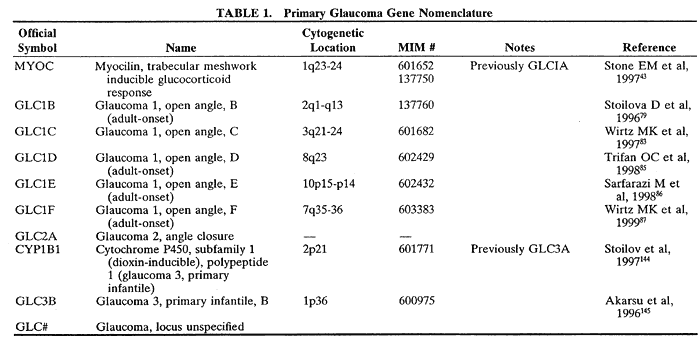 general, by GLC1 (Table 1). To distinguish specific genes or loci, letters are added to the GLC1 in the order of their discovery (e.g., GLC1A, GLC1B). The designation GLC2 is reserved for angle-closure glaucoma and GLC3 for infantile glaucoma. Complicating this scheme is that two of these