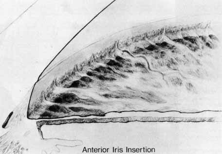 the child matures. In the newborn, the iris inserts into the ciliary body, posterior to the scleral spur. The ciliary body is seen as a distinct band immediately anterior to the iris insertion. The presence of this band usually distinguishes the normal infant eye from one with congenital glaucoma associated with trabeculodysgenesis. Insertion of the infant iris into the angle wall is flat compared to the adult angle recess configuration. Recession of the angle, which turns the iris posteriorly before inserting into the ciliary body, does not occur until the first 6 to 12 months of life. |