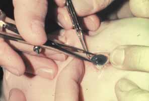 is required, endotracheal intubation should be performed. After anesthesia is administered, the intraocular pressure should be checked as soon as is safely possible, because most general anesthetics lower intraocular pressure. The intraocular pressure may be measured with a hand-held electronic tonometer (Tono-pen), a Perkins hand-held applanation tonometer, a pneumotonometer, or a Schiötz tonometer.11,12 A useful upper limit is 21 mm Hg. However, this value is not absolute, and normal tolerable levels may vary among patients. Corneal changes caused by edema, calcification, or irregular corneal curvature can cause misleading intraocular pressure measurements. The normal horizontal corneal diameter in a full-term newborn is 10 to 10.5 mm and increases to the adult diameter of approximately 11.5 to 12 mm by 2 years of age. A diameter greater than 12 mm in an infant is highly suggestive of congenital glaucoma.13 Measurements of the cornea are made in the horizontal meridian with calipers (Fig. 9). These recordings are accurate to 0.5 mm except when the limbus is stretched as a result of enlargement of the globe.