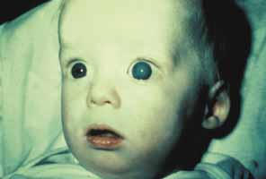 | Signs and symptoms of glaucoma in an infant differ from those of an older child or adult because of the elastic response of the infant eye to elevated intraocular pressure. Infants often present with epiphora, photophobia, and blepharospasm because of corneal stretching, ruptures of Descemet's membrane, and edema.10 The child may become irritable and so photophobic that he or she will bury his or her face to avoid light. Parents may notice haziness and enlargement of the eye and may initially consider the large eyes an attractive feature rather than a warning sign of glaucoma. |