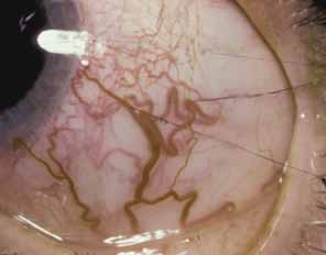 Glaucoma more often occurs when the ipsilateral facial hemangioma involves the lids and conjunctiva (Fig. 15). Glaucoma may occur in infancy, late childhood, or young adulthood. The glaucoma that occurs in infancy looks and behaves similar to glaucoma associated with isolated trabeculodysgenesis and responds well to goniotomy. The glaucoma that appears later in life is probably related to elevated episcleral venous pressure from arteriovenous fistulas.37 In older children, medical therapy should be attempted first. However, if this is not successful, trabeculotomy or trabeculectomy should be considered.