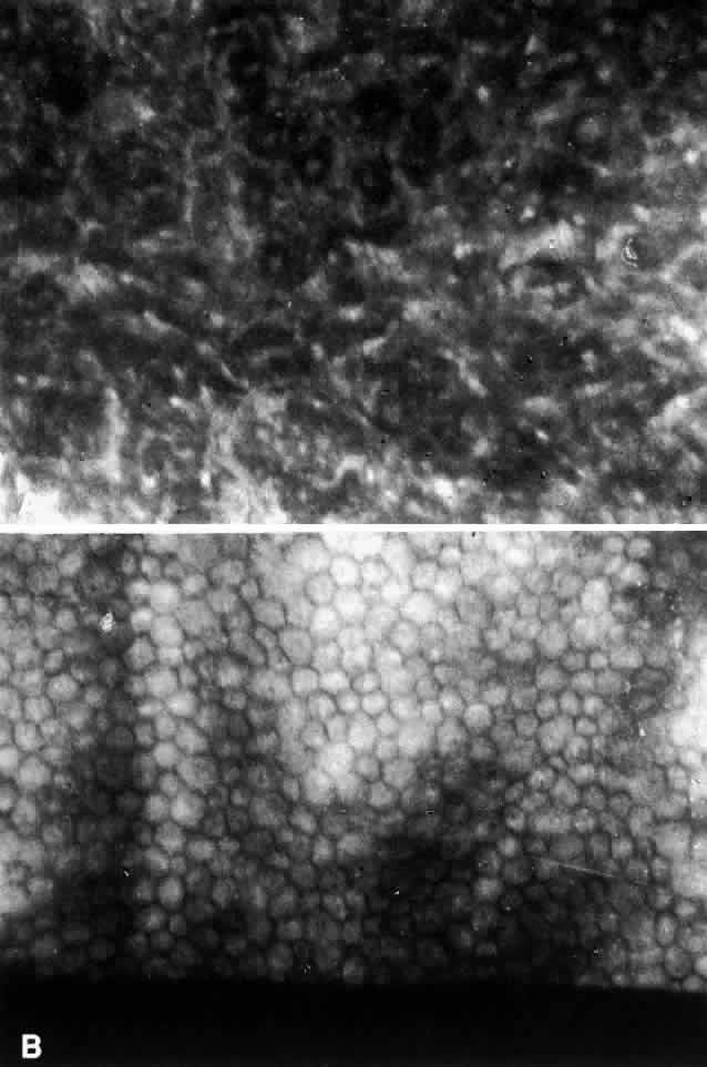 IRIDOCORNEAL ENDOTHELIAL SYNDROME The iridocorneal endothelial (ICE) syndrome consists of three rare clinical entities and their variations that, although separately described, are now considered as a spectrum of disease with a common pathogenetic mechanism. Patients with the ICE syndrome usually present in the third to fifth decades of life having noticed unilateral iris abnormalities or complaining of visual disturbances or ocular discomfort due to corneal edema or elevated intraocular pressure. The syndrome is more common in women, appears to occur sporadically, and has been recognized almost exclusively in whites. There are no known systemic associations.1,2 Clinical Features The iris, cornea, and anterior chamber angle are affected in patients with the ICE syndrome. The major clinical variations within this syndrome are described below and are distinguished by particular patterns of involvement of these structures. PROGRESSIVE (ESSENTIAL) IRIS ATROPHY. Progressive iris atrophy is characterized by prominent atrophy of the iris, with iris stromal thinning progressing to full-thickness iris holes.1,2 Peripheral anterior synechiae develop early, and progress both circumferentially and onto the cornea.1,2 Pupillary distortion and ectropion uveae occur, typically toward the most prominent peripheral anterior synechiae.1,3 Large and sometimes bizarrely shaped iris “stretch” holes occur, apparently from traction of the iris between peripheral anterior synechiae on opposite sides of the globe (Fig. 1).1,3,4 Less common, smaller oval holes may develop adjacent to peripheral anterior synechiae. These “melting” holes are presumed to be caused by iris ischemia resulting from obstruction of iris vessels within the synechiae.1,3 Multiple, fine, pedunculated iris nodules may occur, generally appearing late in the disease process.1,5 The corneal endothelium in involved eyes is described as showing a fine, beaten metal irregularity, sometimes in focal areas. Stromal and/or epithelial edema may be present. In some cases, no definite corneal abnormality is evident.1 CHANDLER'S SYNDROME. The dominant feature in this variant of the ICE syndrome is usually corneal edema, often at normal or only moderate levels of intraocular pressure elevation. Chandler described the corneal endothelium as having a “fine hammered silver appearance.” ,6 Iris atrophy is less prominent in Chandler's syndrome than in progressive iris atrophy and, when detectable, is often limited to the anterior iris stroma. The pupil is usually round or slightly oval.6 COGAN-REESE (IRIS NEVUS) SYNDROME. Patients with Cogan-Reese syndrome are characterized by iris pigmented lesions that range from multiple, pedunculated, nodular lesions to a more diffuse, smooth, velvety change of the iris. The iris surface tends to lose its normal pattern, and it usually appears darker than that of the fellow eye. Ectropion uveae, breaks in the iris stroma, and an ectopic pupil are often present. Peripheral anterior synechiae, corneal edema, and labile glaucoma are characteristic features.7 Pathogenesis On the basis of careful clinical observations and histopathologic study, Campbell and co-workers3 and Eagle and co-workers8 have advanced the now generally accepted hypothesis that the primary abnormality in the ICE syndrome is proliferation of abnormal corneal endothelium. This abnormal endothelium correlates with the beaten metal appearance visible on slit lamp biomicroscopy. If the patient is examined in the early stages of the disease, demarcations between normal and abnormal corneal endothelium may be visible biomicroscopically.9,10 With time, the areas of abnormal endothelium enlarge, so that eventually the entire corneal endothelium is involved.9 The stroma and epithelium overlying the regions of abnormal endothelium may be clear or may become edematous. The specular microscopic changes of the corneal endothelium are sufficiently specific that a masked observer can usually differentiate the ICE syndrome from other endothelial conditions.11 The earliest visible changes are a loss of the uniform hexagonal shape of the endothelial cells. Dark areas begin to appear in individual cells. In more affected corneas there is increased cellular pleomorphism and the dark areas within individual cells become larger, eventually reaching the point at which the endothelial mosaic can no longer be recognized (Fig. 2).9,11 The darker areas within the abnormal endothelial cells may be accompanied by a brighter than normal reflection from the cell borders.12 In clinically normal-appearing areas in some affected eyes, specular microscopy has shown a normal endothelial mosaic but cells that are much smaller than usual9,10; the significance of this is unknown. In some cases, the uninvolved fellow eyes of patients with the ICE syndrome have shown abnormal endothelial cell pleomorphism with lower than expected cell counts.11,13 The abnormal endothelium and the basement membrane that it elaborates eventually spread from the cornea onto the trabecular meshwork and the surface of the iris.3,8 Contraction of this membrane results in the development of peripheral anterior synechiae in areas of previously open angle and may also result in ectropion uveae.3,8 Iris atrophy and full-thickness holes develop as a result of stretching of the iris between synechiae. Since the iris atrophy is actually a secondary phenomenon,8 the term progressive iris atrophy is preferred to the historically used term essential iris atrophy.2Iris nodules may develop in areas involved with the endothelium-basement membrane complex (Fig. 3); it has been suggested that the nodules form as a result of encircling and “pinching off” portions of the iris by the cellular membrane.3,8,14 The nodules are thus a marker for areas of iris endothelialization.14 The various clinical manifestations of progressive iris atrophy, Chandler's syndrome, and the Cogan-Reese syndrome can thus all be explained by th