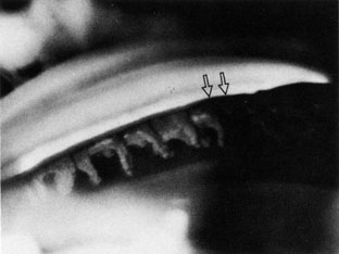 Pupillary block occurs quite frequently after the placement of an anterior chamber intraocular lens subsequent to cataract surgery (Fig. 10). Thus it is generally recommended to create a peripheral iridectomy at the time of surgery when placing an anterior chamber intraocular lens. Although rare, pupillary block glaucoma also can occur after posterior chamber intraocular lens implantation, even years after the original surgery.68