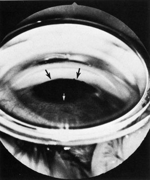 steroid use is prolonged. If the lens anomaly is the cause of the glaucoma or visual impairment resulting from cataractous changes is present, removal of the lens may be indicated. A peripheral iridectomy in the presence of a subluxated clear lens may relieve the glaucoma. The treatment of angle-contusion glaucoma is essentially the same as for open-angle glaucoma, regardless of age. If hyphema is present, a secondary glaucoma may result. This is more commonly seen in the eight-ball or total anterior chamber hemorrhage. In these patients, cataracts, either of posterior subcapsular or anterior subcapsular location, often are seen. Treatment is directed toward control of the bleeding. If blood staining of the cornea or intractable intraocular pressure ensues, irrigation of the chamber may be attempted. Various methods, including diathermy, fibrinolysis, and cryoextraction of the clot, have been tried in the treatment of this difficult problem.31 Essentially, treatment has to be individualized because there is no commonly accepted mode of therapy. |