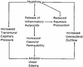 may return after reversal of chronic hypotony. Pathologic changes in severe hypotony reveal generalized edema of the uvea, retina, and optic nerve head, with accumulation of proteinaceous fluid in the supraciliary and suprachoroidal space (see Fig. 4).40,98 Hypotony itself causes a modest breakdown of the blood–aqueous barrier99 (presumably from inflammatory autacoids) comparable to the release of prostaglandins after paracentesis.100 Because the permeable blood–aqueous barrier is associated with reduced aqueous humor formation and increased vascular permeability, the possibility for a self-perpetuating cycle of hypotony is created (Fig. 7). |
