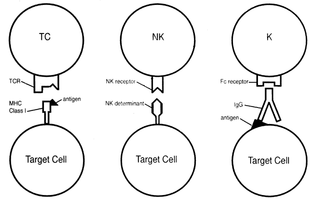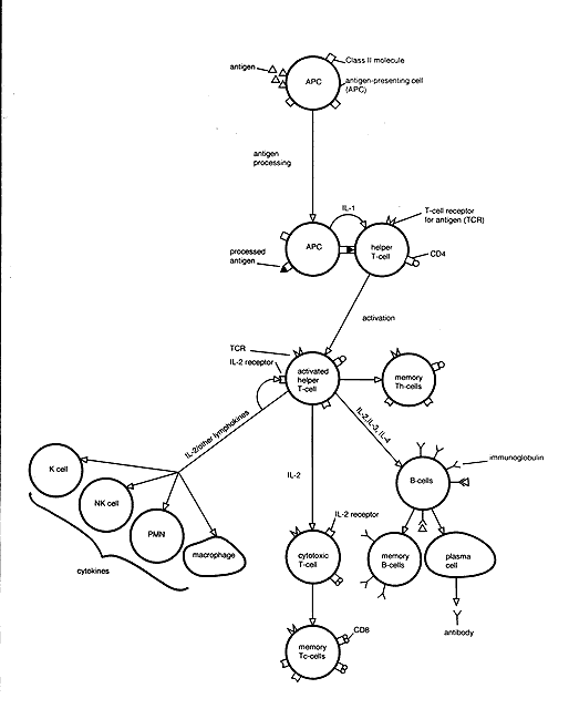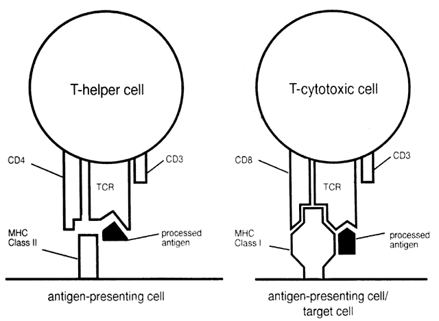 The T-cell antigen receptor (TCR) is the definitive T-cell marker.3 There are two types of TCR, TCR1 and TCR2, the latter being the most common (present on 95% of T cells). TCR2 is composed of two peptide chains, alpha and beta, linked to form a heterodimer. This is closely associated with CD3 molecules (CD3 subunit), forming the TCR2 receptor complex. TCR1 is similar in structure to TCR2 but contains gamma and delta polypeptides. The TRC2 group can be divided into those cells that are CD4+ (helper T cells) and those that are CD8+ (suppressor/cytotoxic T cells). Helper T cells recognize antigen associated with class II molecules. The functions of CD4+ cells include promotion of T-cell and B-cell differentiation, regulation of suppressor/cytotoxic T-cell proliferation/function, and production of lymphokines (see below). They also play a role in regulation of erythropoiesis. Those TCR2 cells associated with CD8+ are suppressor/cytotoxic T cells. These cells recognize antigen associated with class I molecules and function as cytotoxic cells. Also, they act as suppressors of T- and B-cell function. B-Cell Markers The classic B-cell marker is surface immunoglobulin produced by the cell itself. These immunoglobulins act as B-cell receptors for antigen. On circulating B cells, the surface immunoglobulins are predominately IgM and IgD molecules, and, for a given cell, they share the same antigen specificity. CD19, CD20, and CD22 are presently the markers commonly used to identify B cells.3 Other markers found on B cells include MHC class II antigens, which are important in cooperation with T cells, complement receptors CR1 (for C3b) and CR2 (for C3d), CD5 (also expressed on all T cells), and surface receptors for the Fc portion of IgG. CELLS OF THE IMMUNE SYSTEM T Lymphocytes T cells regulate the immune response, are the major players in cell-mediated immunity, and induce antibody production by B cells. T-cell precursors arise from stem cells in the yolk sac, the fetal liver, and, later in prenatal development, the bone marrow. These immature cells migrate to the thymus, where maturation follows. Mature lymphocytes migrate via the circulation to the spleen, lymph nodes, tonsils, and unencapsulated lymphoid tissue. The latter includes mucosa-associated lymphoid tissue (MALT), such as that in the gut (GALT), bronchi (BALT), and conjunctiva (CALT). Lymphocytes make up 20% of the total circulating leukocyte count. Mature T lymphocytes make up 70% to 80% of peripheral blood lymphocytes. In lymph nodes, T cells reside in deep paracortical areas around B-cell germinal centers (Fig. 2) and in periarteriolar areas of white pulp of spleen. The T-cell pool is maintained throughout the years by antigen-driven expansion of long-lived T cells that reside in the peripheral lymph organs. There are two major subsets of T lymphocytes--helper T cells and suppressor/cytotoxic T cells. HELPER T CELLS. Helper T cells are CD4+ lymphocytes. They are class II restricted (i.e., they respond to antigens presented in conjunction with class II molecules on the surface of antigen-presenting cells [APC], such as macrophages). The CD4 molecule has an adhesive function and binds to the class II (HLA-DR, -DQ, or -DP) molecule on the surface of the APC. This enables TCR to bind to the antigen in a stable fashion. Helper T cells function as regulator/modulator cells. Those CD4+ cells that display the helper function (i.e., positively influence the immune response of T cells and B cells) are CD29+ . These cells induce B cells to produce antibodies. A subset of CD4+ cells that are CD45R+ display the suppressor-inducer function (i.e., induce suppressor/cytotoxic function in CD8+ cells, which results in suppressed antibody production by B cells).4 SUPPRESSOR/CYTOTOXIC T CELLS. Suppressor/cytotoxic T cells are CD8+ and are class I restricted (i.e., cytotoxic T cells recognize antigens presented in association with class I [HLA-A, -B, or -C] molecules). CD8+ binds to the class I molecule of the antigen-presenting cell. This stabilizes TCR binding to antigen on the surface of the antigen-presenting cell. When this condition is met, lysis of the target cell can occur (see below). These cells play an important role against intracellular parasites and viruses. Suppressor cells may act on either T cells or B cells and perform a down-regulating function. Suppressor/cytotoxic T cells may be activated by helper T cells that are CD45R+ (see suppressor-inducer function above). No surface markers are yet known that distinguish between CD8+ suppressor and cytotoxic cells. Helper T cells constitute 45% of circulating lymphocytes and suppressor/cytotoxic T cells 25% of circulating lymphocytes, giving a normal helper T/suppressor T ratio of 1.8:1. B Lymphocytes B cells are responsible for humoral immunity (i.e., that arm of the immune response mediated by antibodies). B lymphocytes arise from precursor cells in the bone marrow (in birds, in the bursa of Fabricius, hence the name B cell). Mature B cells express surface immunoglobulins, which, as previously discussed, act as receptors for foreign antigen. Each B cell produces only one type of immunoglobulin heavy and light chain variable region; thus, each B cell has specificity for only one antigen. B cells constitute 10% to 15% of circulating lymphocytes. In lymph nodes, B cells are located in cortical germinal centers and medullary cords, where they are the principal cell type (see Fig. 2). B cells are located in primary and secondary germinal centers of the white pulp of the spleen. When mature unprimed B cells are stimulated by antigen, they either develop into plasma cells that produce antibody or become memory cells. This is known as the primary response. Memory cells are long lived and respond when re-exposed to the same antigen in the future, enabling an amplified secondary response. Memory cells have higher-affinity antigen receptors and are prone to make IgG earlier than unprimed B cells.5 Pl