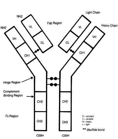 Interleukin-1 is produced primarily by macrophages but also by LGL and B-cells. IL-1 induces helper T-cell activation, lymphokine release, and IL-2 expression, as well as B-cell proliferation and differentiation (lymphocyte activating factor). IL-1 promotes macrophage chemotaxis and cytocidal activity, polymorphonuclear leukocyte (PMN) activation and chemotaxis, and increased NK activity. IL-1 induces fever and has been called leukocytic pyrogen. The tumor necrosis factors share many of the actions of IL-1. Interleukin-2 is produced by T cells and plays a key role in T-cell and B-cell proliferation and maturation. It enhances cytotoxic T-cell activity as well as NK and LAK activity. Interleukin-3 is produced by T cells and stimulates differentiation of hematopoietic precursors of multiple cell lineages; it is also called multi-colonystimulating factor (multi-CSF). IL-4 is produced by activated T cells and induces B- and T-cell proliferation. IL-4 increases IgE secretion by B cells. IL-5 promotes B-cell and eosinophil growth and differentiation. IL-3, -4, and -5 play a role in allergic and antiparasitic inflammatory responses.9 IL-6 is produced by T and B cells and macrophages and fosters B-cell growth and differentiation. It also induces production of acute-phase proteins by hepatocytes. IL-7 produced by bone marrow stromal cells promotes growth of B- and T-cell precursors. IL-8 is chemotactic and may be involved in adhesion of PMNs to vascular endothelium. The tumor necrosis factors (TNF) are produced by lymphocytes and macrophages and result in activation of macrophages, granulocytes, and cytotoxic cells. TNF enhances MHC expression and antigen presentation. TNF promotes the tumoricidal activity of monocytes and protection against microorganisms. TNF may mediate the circulatory collapse and tissue necrosis seen in septicemia. Interferon-α and -ß promote MHC class I induction and antiviral protection. IFN-α and IFN-ß are produced by virus-infected cells early in infection and induce resistance to virus in noninfected cells. IFN-γ (macrophage activation factor) is released by T cells and LGL. It has the ability to induce class II receptor expression on many cell types (e.g., vascular endothelial cells) that do not usually express HLA-DR molecules. This promotes the participation of these cells in the immune process. IFN-γ also stimulates macrophage activation, NK activity, and B-cell proliferation. Migration inhibition factor is produced by T cells and has the effect of keeping macrophages at the site of inflammation. Colony-stimulating factors (e.g., M-CSF, G-CSF, and GM-CSF) stimulate stem cell division and differentiation. HUMORAL IMMUNITY Humoral immunity (i.e., antibody-mediated immunity) involves production of antibodies locally (e.g., IgA) or systemically, triggered by antigen stimulation (antigen = antibody generator). The basic function of antibody is to bind antigen. Antigenic targets include extracellular bacteria and viruses, allergens, toxins and other foreign proteins, viral antigens expressed on infected cells, and altered autologous cellular or soluble proteins or carbohydrates. Immunoglobulins play a role in opsonization, immune complex formation, complement activation, antibody-dependent cellmediated cytotoxicity, type I hypersensitivity, and autoimmunity. The phenomenon of change from IgM to IgG while maintaining the same specificity for antigen that occurs in the course of an immune response is known as isotype switching, an event under T-cell control. Free serum antibodies provide short-term specific immunity with a half-life of about 25 days; they are essentially absent after 1 year. Structure Each immunoglobulin molecule consists of two identical heavy chains and two identical light chains joined by disulfide bonds (Fig. 6). The type of heavy chain (alpha, delta, gamma, mu, epsilon) determines the immunoglobulin isotype or class (i.e., IgA, IgD, IgG, IgM, IgE, respectively). Light chains are of two types, kappa and lambda. IgG can be divided into four subclasses, IgG1, IgG2, IgG3, and IgG4. IgA has two subclasses, IgA1, IgA2. In each case, the differentiation is on the basis of specific antigenic determinants on the heavy chains. Each differentiated B cell/plasma cell produces only one type of antibody with identical heavy and light chains. It should be noted that numerous molecules involved in the immune processes possess similarity in amino acid structure and sequence to immunoglobulin heavy and light chains (e.g., HLA, CD2, CD4, CD8, TCR), hence the concept of the immunoglobulin supergene family. Each heavy and light chain is made up of constant (C) and variable (V) regions (domains). Light chains have one V and one C region, VL and CL, respectively. Heavy chains have one variable (VH) region and three or four constant (CH) regions, depending on the immunoglobulin class. Constant regions share the same structure for each immunoglobulin molecule of the same isotype and subclass. Constant regions are involved in IgM and IgG binding to complement or IgG binding to Fc receptors of macrophages, LGL, B cells, neutrophils, and eosinophils. The Fc (Fc = crystallizable fragment) region of the immunoglobulin molecule is the CH region at the carboxyterminus end. Variable regions (both VL and VH) are found at the amino terminal end of the molecule. The variable regions are involved in binding to antigen, being known as the Fab (ab = antigen binding) region of the molecule (see Fc above). There are two antigen-binding sites per monomer. Within the VL and VH regions are hypervariable regions whose amino acid sequence is unique to that immunoglobulin molecule and specific for binding to a particular antigen. This constitutes the antigen-binding site. Each antibody has unique antigenic determinants in its variable regions called idiotopes, the sum of which determines its idiotype. A second set of antibodies is generated that is directed at the idiotype; these are called a