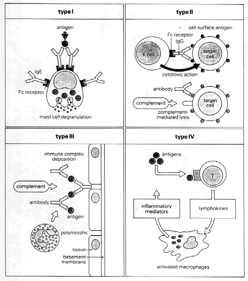 The functions of the complement system include opsonization, chemotaxis, anaphylotoxin activity, and cytotoxicity. Opsonization refers to the process of binding by C3b (or antibody) to microorganisms, facilitating phagocytosis by macrophages and neutrophils with C3b receptors (or Fc receptors in the case of opsonization by antibody). Neutrophil chemotaxis is promoted by C5a. C3a, C4a, and C5a can bind to receptors on mast cells and basophils, promoting degranulation and release of histamine and other inflammatory mediators. The cytotoxic function of complement is performed by the membrane attack complex (C5b–C9). This complex forms transmembrane channels in target cells, leading to osmotic lysis. CLASSIC HYPERSENSITIVITY REACTIONS The Gell-Coombs classification of hypersensitivity reactions11 has provided an organized approach to understanding the major mechanisms of immune response (Fig. 10). However, seldom does any one of the reactions occur purely by itself. Most often, more than one mechanism is at work in any immune reaction, and there is considerable interaction and overlap.