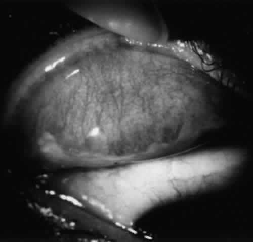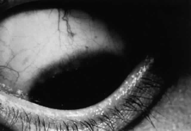 CICATRICIAL PEMPHIGOID Cicatricial pemphigoid is a systemic autoimmune disease affecting the basement membrane zone of the skin and mucous membranes that is characterized by recurrent blisters or bullae and subsequent scar formation.242 Cicatricial pemphigoid is typically a disease of the elderly, with an age range of 20 to 87 years.243 Skin involvement is less frequent than mucous membrane involvement, being present in 9% to 24% of cases. Mucous membrane involvement may affect the conjunctiva, nose, mouth, pharynx, larynx, esophagus, anus, vagina, and urethra. Oral lesions are found in 91% of cases. The conjunctiva is affected in 70%.244,245 Ocular cicatricial pemphigoid (OCP) is a bilateral chronically progressive condition punctuated by exacerbations of activity, resulting in conjunctival cicatrization. Ocular manifestations include subconjunctival fibrosis, fornix foreshortening, symblepharon formation (Fig. 25), obstruction of the ducts of the main and accessory lacrimal glands, meibomian gland obstruction, and lid malposition. Exposure and keratitis ensue, the ultimate result being corneal scarring and ulceration and eventual blindness.