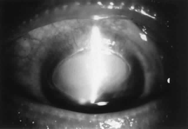 Either form of conjunctival vernal can be accompanied by changes in the upper one half of the cornea, including micropannus and a farinaceous epithelial keratopathy known as keratitis epithelialis vernalis of Tobgy, consisting of tiny gray-white intraepithelial opacities (“dusting of flour”). Punctate epithelial keratitis may evolve into epithelial macroerosions. Such macroerosions may evolve into a shield ulcer (Fig. 16). This is an indolent, oval, superficial ulceration with thickened, opaque edges and plaquelike deposition of mucus, fibrin, and inflammatory debris. This deposition prevents re-epithelialization. Shield ulcers usually affect the superior cornea but also can occur inferiorly. With resolution, oval or ring scarring can remain in the superficial stroma. Another corneal finding typical of vernal is pseudogerontoxon, an arclike or annular deposition of unknown nature in the corneal periphery. There is an association between vernal and keratoconus.58 Pellucid marginal degeneration, keratoglobus, and Terrien's marginal degeneration have also been described.59,60 Pathophysiology Vernal keratoconjunctivitis involves type I and type IV (including cutaneous basophil hypersensitivity) mechanisms.61 Eosinophils and free eosinophilic granules on examination of conjunctival scrapings are characteristic. Elevated levels of tear IgE and/or IgG, histamine, tryptase, eosinophilic major basic protein, Charcot-Leyden crystal protein (found when eosinophils have undergone fragmentation),62 prostaglandins, and leukotrienes are present. Histopathologically, the conjunctival epithelium is thickened; the epithelium shows mast cells, basophils, and eosinophils, none of which are seen in normal conjunctival epithelium. The substantia propria shows hyperplasia of connective tissue and infiltration by mast cells, basophils, eosinophils, plasma cells, lymphocytes, and macrophages. Eosinophils and basophils are not normally found in the substantia propria. Mast cells are found in higher numbers in the conjunctiva, they are located more superficially, and the percentage of degranulated mast cells is increased over normal controls.61,63 These findings support the concept that this is a mixed type I and IV reaction. Although it was previously thought that eosinophils may dampen allergic inflammation, evidence now suggests that eosinophils play an active role and contribute to tissue damage in allergic disease. Eosinophil granule major basic protein is known to stimulate mast cell degranulation and may explain the extensive and sustained mast cell degranulation seen in vernal keratoconjunctivitis (and contact lens-induced GPC).64 The corneal epithelial manifestations of vernal may be in part related to mechanical friction caused by tarsal conjunctival papillae. More likely is that corneal epithelial damage occurs from chemical mediators released by mast cells and eosinophils, particularly eosinophil major basic protein. Eosinophil major basic protein possesses cytotoxic capabilities65,66 and prevents epithelial healing.67 Eosinophil major basic protein has been detected in the inflammatory debris of vernal ulcers.68 Unless the underlying inflammatory process is treated with success medically or, in some cases, the inflammatory debris of the ulcer is removed surgically, healing will not occur, implicating eosinophil major basic protein in the ulcerative process by inhibition of corneal epithelial healing.68 Treatment General measures include “climatotherapy” (i.e., moving to a cooler and moister climate), air-conditioning, humidification, and air filtering to remove dust and other allergens. Cold compresses are helpful to relieve itching. Patching can be helpful. The cornerstone of medical therapy is the use of mast cell stabilizers. Topical cromolyn sodium 2% or 4% (Opticrom) is given four times a day, and in severe cases up to six times a day. If a patient has a history of seasonal exacerbation, he or she can be instructed to start cromolyn a month or so prior to the expected onset of the symptoms; some require cromolyn all year round two to four times a day as maintenance therapy. As mentioned previously, this drug has few side effects and is well tolerated.69 A clinical response takes 1 to 2 weeks to become evident. In the interim, mild cases can be treated with artificial tears, topical vasoconstrictor-antihistamines, or topical cyclooxygenase inhibitors. Topical lodoxamide 0.1%, a newer mast cell stabilizer, has been shown to be effective in vernal, eliciting an earlier and greater response than cromolyn sodium.51 Also, oral antihistamines can be helpful. Topical levocabastine (H1-receptor blocker) offers promise as adjunctive therapy. Topical mucolytic agents (e.g., acetylcysteine) are seldom helpful. More severe cases (i.e., marked symptoms or corneal involvement) will require topical corticosteroids four or more times a day for a few weeks until cromolyn takes effect. Thereafter, topical corticosteroids should be tapered over a week or so to prevent rebound, and then should be discontinued to minimize the chance of side effects. A few weeks of topical corticosteroids are usually sufficient, but some patients may require maintenance therapy with as low a dose as possible. Very severe cases, especially if unresponsive to treatment, will require a course of oral corticosteroids. Topical cyclosporine may be helpful also in refractory cases.70,71 A new direction in therapy is the use of cyclooxygenase inhibitors. Oral aspirin has been reported to aid remission of vernal72-74; however, one must be wary of acetylsalicylic acid (ASA) in those with asthma.75 Other nonsteroidal anti-inflammatory agents, such as indomethacin, tolmetin, and suprofen, applied topically, have been shown to be effective in the treatment of vernal keratoconjunctivitis.76–78 Desensitization is not commonly used; its efficacy is a subject of debate. Cryotherapy to the tarsal surface is effective in providing immediate sho