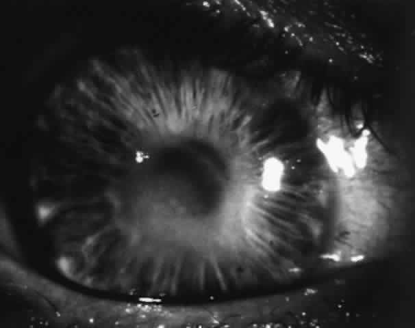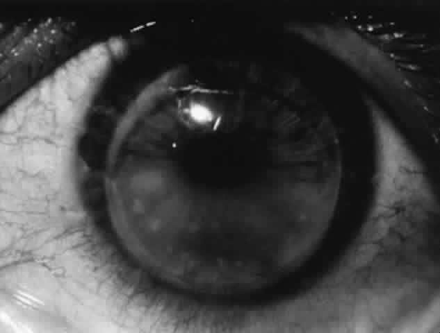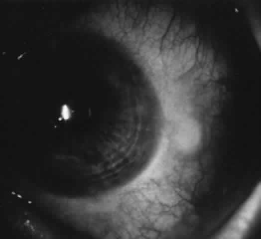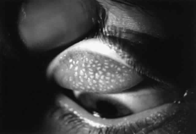 In the limbal form, papillae are located on the bulbar conjunctiva at the corneal limbus, usually superiorly, but they can involve the limbus elsewhere (Fig. 14). These papillae often have a gelatinous appearance; they may coalesce and form a ridge along the limbus. There may be associated micropannus formation. Small, fine white dots may be seen on the limbal papillae; these are Horner-Trantas' dots and represent focal collections of eosinophils (Fig. 15). Horner-Trantas' dots are usually seen at the superior limbus but can be seen elsewhere on the limbus and on the bulbar and tarsal conjunctiva. The limbal and palpebral forms of vernal can coexist. The limbal form is more common in blacks.