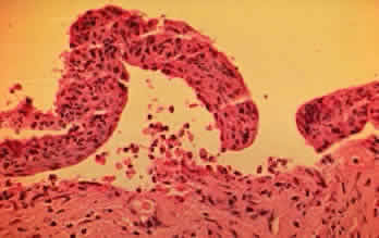 A practical approach to the problem of drug-induced conjunctival scarring is to discontinue the topical agents, if this can be done, and follow the patient for progressive conjunctival shrinkage.25 If the drugs are absolutely essential to control glaucoma, they should be continued. If progressive conjunctival shrinkage occurs, the patient probably has CP and immunosuppressant therapy may be warranted. The determination of whether these drugs simply cause scarring that mimics CP or whether they cause or promote CP in a particular patient can be made only by long-term follow-up after drug discontinuation for the development of chronic, progressive conjunctival shrinkage or the development of extraocular lesions. HISTOPATHOLOGIC FINDINGS Cicatricial pemphigoid is characterized by subepithelial blisters or bullae. Electron-microscopic studies show that the separation at the margin of a blister is located within the lamina lucida between the plasma membrane of the basal cells and the electron-dense lamina densa.5 The conjunctival epithelium in CP shows squamous metaplasia, with parakeratosis and keratinization (Fig. 7).26 Mucus-producing goblet cells are scarce or lacking.11,27 Because the mitotic rate of conjunctival epithelium is higher in patients with CP, it has been suggested that CP is associated with hyperproliferation of the conjunctival epithelium, with a failure of conjunctival differentiation because of reduced goblet cells.28 In the early stages of conjunctival disease, granulation tissue is found beneath the conjunctival epithelium, with an infiltration predominantly of lymphocytes and plasma cells, with occasional eosinophils and relatively few neutrophils.13,26 Later, pronounced fibrosis takes place in the conjunctival stroma and is responsible for the conjunctival shrinkage that characterizes the disease.9,10 Hyperproliferation of conjunctival fibroblasts from patients with CP has been demonstrated in tissue culture.29 One study described perivascular inflammatory cell infiltration in 20% of specimens and substantial mast cell participation and degranulation.4 In addition to the chronic inflammatory cells typical of CP, conjunctival biopsy specimens from patients with acute manifestations of CP show numerous neutrophils within and beneath the conjunctival epithelium (Fig. 8).15