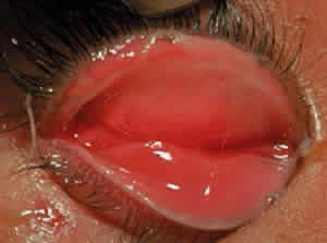 Conjunctival or corneal bullae have been described10 but are rarely observed, perhaps because they rupture readily because of the blinking action of the eyelids. Breakdown of the corneal epithelium most commonly results from entropion with trichiasis; lagophthalmos with abnormal blinking and exposure; and a diminished, unstable tear film. These erosions may become complicated by secondary bacterial infiltrates and ulcers. Predisposing factors for the development of microbial keratitis include topical corticosteroids, bandage contact lenses, trichiasis, corneal surgery, lagophthalmos, and meibomianitis.12 Corneal neovascularization may develop either as a pannus or pseudopterygium. Smears of conjunctival scrapings from patients with CP reveal neutrophils, keratinized squamous cells, and eosinophils.13 In a study of the bacterial flora of patients with CP, potential pathogens—mainly mannitol-positive staphylococci—were recovered from the eyelids and conjunctiva of 81% of patients with this disease.2 Glaucoma may be more prevalent in patients with CP.14 COURSE OF OCULAR DISEASE Cicatricial pemphigoid generally runs a chronic course, characterized by progressive shrinkage of the conjunctiva. When the end stage of this disease is reached, the eye lacks tears and has obliterated conjunctival fornices, ankyloblepharon, and a keratinized ocular surface epithelium. Episodes of acute disease activity may interrupt this chronic progressive course and result in rapid shrinkage of the conjunctiva.15 Acute disease activity may be precipitated by surgical procedures, including conjunctival biopsy, lysis of symblepharon, oculoplastic procedures on the eyelids, and cataract extraction. The acute manifestations consist of localized, ulcerated conjunctival mounds (Fig. 4) or diffuse, severe conjunctival hyperemia and edema (Fig. 5). Before concluding that acute inflammatory activity is caused by the disease process, it is necessary to eliminate other confounding factors such as trichiasis, exposure, or bacterial blepharoconjunctivitis.