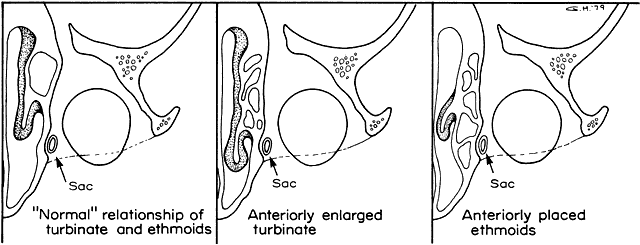 muscles. BONY CONDUIT Within the nasofrontal process of the maxilla at the anterior nasal portion of the orbit is the lacrimal fossa, in which is found the lacrimal sac. From there, the nasolacrimal canal, which contains the nasolacrimal duct, extends down inside the lateral wall of the nose and opens under the inferior turbinate or concha in the vault of the meatus of the turbinate. The nasolacrimal canal is approximately 16 mm posterior from the anterior tip of the turbinate and is located between the anterior third and the middle third of the meatus of the turbinate. It exits in the vault of the meatus of the turbinate 17 mm above the floor of the nose laterally. There are, however, normal variations in which the end of the nasolacrimal canal can extend farther down and open at various positions in the lateral wall of the nose. The lacrimal sac fossa is present in the anterior-inferior nasal portion of the bony orbit and is delineated anteriorly by the anterior lacrimal crest and posteriorly by the posterior lacrimal crest. If viewed from the inside of the nose, it would be outlined on the lateral wall of the nose in front of the anterior tip of the middle turbinate (Fig. 1). The nasolacrimal canal is not vertical in direction but angulates posteriorly 15 degrees and slightly inward almost 5 degrees to reach its final destination under the inferior turbinate (Fig. 2). Two sinuses are in intimate relationship with the lacrimal bony conduit, the maxillary sinus or antrum, which forms the lateral wall of the nose in that area, and the ethmoidal sinus, which borders the posterior edge of the lacrimal sac fossa and the superior nasolacrimal duct. The ethmoidal sinus is a system of mucous membrane-lined air cells that are positioned immediately posterior to the lacrimal sac fossa and the lacrimal bone. It is not uncommon (as many as 80% to 90% of patients),1 however, for the ethmoidal air cells to encroach in various degrees into the bone at the posterior lacrimal crest; in some cases, they actually extend as far as the anterior lacrimal crest area separating the lacrimal sac from the lateral wall of the nose and intranasal cavity (Fig. 3). Also, the anterior tip of the middle turbinate may extend various degrees anteriorly into the intranasal cavity. These anatomic variations become important considerations when lacrimal surgical procedures are necessary.