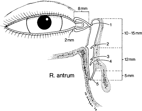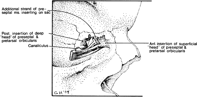 MEMBRANOUS CONDUIT Dimensions Contained within the bony conduit and the nasal portion of the eyelids are the epithelium-lined tear ducts through which tears pass from the eyelids into the nose. The openings of this membranous conduit in the eyelids are the upper and lower puncta, which are located 6 mm from the inner canthus. The punctal openings in the eyelid are 0.3 mm in diameter. The canalicular portion just beyond the punctum is called the ampulla. It is vertically oriented for 2 mm and balloons out to a diameter of 2.5 mm (Fig. 4). The canaliculi then narrow to about 1 mm in diameter and extend nasally 8 mm to enter the lacrimal sac. In more than 90% of people, the canaliculi join before entering the sac at the level of the lower border of the medial canthal tendon. The tear sac itself is 12 to 15 mm in vertical length, and in most instances there is a portion above the entrance of the common canaliculus 3 to 4 mm in height called the fundus (dome), which is usually compressed by the medial canthal tendon. The nasolacrimal duct extends from the inferior portion of the sac through the nasolacrimal canal or bony conduit and travels 12 mm to the position where it opens underneath the inferior turbinate in a space called the meatus (see Fig. 4). The membranous conduit in most cases extends 5 mm farther downward and usually is located in the vault portion underneath the inferior turbinate. However, again, there is some variability in the nasolacrimal canal and duct, and it may open farther down on the lateral wall of the nose in a slitlike manner (Fig. 5). Structure The lining of the lacrimal canaliculi, the sac, and the nasolacrimal duct is pseudostratified columnar epithelium similar to that found in the upper respiratory system. The walls contain much elastic tissue. The canaliculi, in particular, contain large amounts of elastic tissue. In addition, the lacrimal sac and the nasolacrimal duct have collagen, elastic fibers, and amounts of lymphoid tissue in the walls.2,3 The mucous membrane within the sac and nasolacrimal duct is arranged into membranous folds that act as valves. The two most important folds, as best as can be determined clinically, are the valve of Rosenmuller, where the common canaliculus enters into the sac, and the valve of Hasner (plica lacrimalis) at the end of the nasolacrimal duct under the inferior turbinate. Other valvelike folds have been identified, as have valvelike constrictions at the junction of the sac in the nasolacrimal duct (valve of Krause, sinus of Arlt) and within the nasolacrimal duct (spiral valve of Hyrtl and the valve of Taillefer; see Fig. 4). ENCOMPASSING SOFT TISSUE The muscles within the eyelid in front of the tarsus (pretarsal orbicularis), the protractor muscles, are anchored at the lateral canthal tendon and the lateral palpebral raphe. They travel horizontally across the surface of the upper and lower tarsus, and as they reach the medial canthal area they split into a superficial and deep portion or head. The deep head of the pretarsal orbicularis muscle from the upper and lower lid inserts on the lacrimal bone at the posterior lacrimal crest behind the sac and in some cases has been referred to as Horner's muscle. An additional strand of orbicularis muscle from the preseptal area in the lower lid inserts on the periosteum, which covers the lacrimal sac and its fossa, which extends from the posterior to the anterior lacrimal crest described by Jones.4 The superficial head of the pretarsal orbicularis and preseptal orbicularis fibers insert in a dense conjoined medial canthal tendon anterior to the fundus of the lacrimal sac (Fig. 6). |
