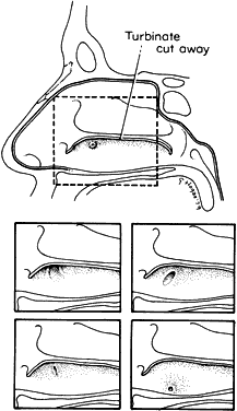 Silicone tube intubation can be performed under local or general anesthesia. In either case, the nasal mucosa and inferior turbinate are vasoconstricted with combined pediatric oxymetazoline hydrochloride (Afrin) and pediatric Neo-Synephrine 1/8% nasal sprays. The lacrimal punctum is gently dilated to allow passage of the Crawford probe and olive tip. In some patients, a small one-snip procedure is performed to allow easy entry and passage of the lacrimal probe and silicone tubing. The probe is lubricated with an ophthalmic antibiotic ointment and passed first vertically through the lower punctum into the lower canalicular system. With the lower lid held on stretch to avoid kinking of the canaliculus, the probe is then rotated 90 degrees so that it is in the horizontal plane. The probe is then advanced nasally until it enters the lacrimal sac and encounters the medial orbital wall. It is then rotated 90 degrees vertically, angled 15 degrees posteriorly, and advanced down through the nasolacrimal duct. The probe exits from underneath the inferior turbinate, normally at the junction of the anterior and middle thirds of the undersurface of the turbinate (Fig. 17). With the aid of a nasal speculum and a fiberoptic headlight, the surgeon should visualize the olive-tipped probe exiting from under the inferior turbinate. It is helpful for the surgeon to stand on the patient's left when visualizing the extreme lateral inferior portion of the right nasal cavity to locate the lacrimal probe. The surgeon should engage the Crawford probe with the Crawford hook. Withdrawing the lacrimal probe slightly should allow the olive tip to engage snugly within the hook. The entire Crawford probe is then withdrawn from the nose. A similar maneuver is used to intubate the upper eyelid canaliculus, leading into the lacrimal sac and nasolacrimal duct. Direct visualization of the lacrimal probe avoids unnecessary manipulation or “raking” maneuvers along the nasal mucosa.