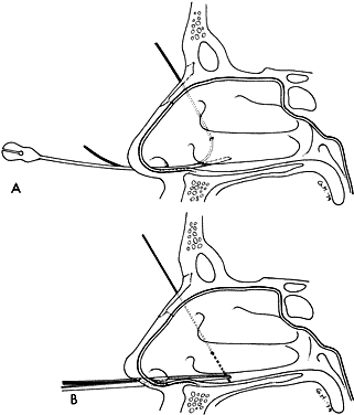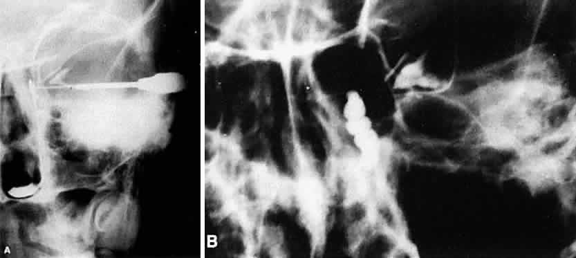 Visualization of the lacrimal probes is also very helpful when using the Quickert-Dryden intubation set. With this type of probe, a grooved director may be slid under the inferior turbinate to allow the probe to be advanced out of the nose (Fig. 18A). Alternatively, a hemostat can be used to grasp the tip of the probe and withdraw it from the nose (see Fig. 18B). Crawford tubing has an intraluminal 6-0 silk suture. The metal probes are cut loose from the distal ends of the silicone tubing. A Crawford stripper is used to cut the excess silicone tubing that extends beyond the external naris. The two ends of 6-0 silk suture are then tied together in multiple knots to secure the silicone tube as a single loop. The surgeon may suture this loop of silicone tubing to the nasal septum or lateral alar cartilage internally.96 It is important to avoid tying the silicone tubing under excessive tension, which could cause erosion through the lacrimal puncta and canaliculi. Silicone lacrimal tubes are typically left in place for 3 to 6 months97 and can be removed via the interpalpebral fissure in an office setting.98 Experimental studies have shown that the silicone tubing material is inert and well tolerated by the canaliculi.99 Reports of allergic reactions are rare.100 In most patients, tear flow and lacrimal elimination occur readily around the silicone tubes down through the lacrimal outflow system. There is some tendency, however, for mucus to accumulate. APPROACH TO ACUTE VERSUS CHRONIC EPIPHORA As emphasized previously, it is critical to rule out causes of hyperlacrimation. Acute epiphora symp-toms (duration of symptoms less than 6 months) may be due to a potentially reversible inflammatory blockage of the nasolacrimal duct (early PANDO). Medical anti-inflammatory treatment or silicone tube intubation or both may be considered in these cases. Careful examination for punctal stenosis is also important in patients with acute onset of symptoms. Patients with chronic epiphora symptoms (duration of symptoms longer than 12 months) usually have permanent nasolacrimal duct obstructions (late PANDO). DCR remains the treatment of choice. Treatment of patients whose epiphora symptoms have persisted for 6 to 12 months is ambiguous. Specific treatment is always individualized for each patient. SILICONE LACRIMAL TUBES: SELECT PATIENTS ONLY Angrist and Dortzbach have evaluated the role of silicone tube intubation in adults with PANDO.101 This study compared the treatment results in patients with partial (functional) blockage of the nasolacrimal duct and total nasolacrimal duct obstructions. On attempted irrigation, patients with functional nasolacrimal duct obstructions typically show reflux of fluid from the opposing punctum and simultaneous entrance of fluid into the posterior pharynx (i.e., there is only a “partial” blockage of the nasolacrimal duct). These patients present with symptoms of chronic epiphora, although they usually do not have symptoms of chronic infection. In these patients, the fluorescein dye disappearance test shows delayed dye disappearance. The Jones I test is negative (no dye retrieved); the Jones II test is positive (dye is retrieved). A dacryocystogram may confirm anatomic and functional pathology in the nasolacrimal duct. Angrist and Dortzbach studied silicone tube intubation in 23 cases of functional nasolacrimal duct obstruction. Silicone tubes were left in place approximately 5 months in most cases. With mean follow-up of almost 3 years, the patients' symptoms of epiphora were successfully alleviated in 70% to 80% of cases. Early relief of the patients' symptoms with the silicone tubes in place was a favorable prognostic sign. By comparison, silicone tube intubation in patients with total anatomic obstruction of the nasolacrimal duct yielded poor results. Based on pathologic studies of the nasolacrimal duct, the late fibrotic stages of PANDO result in total cicatricial obstruction of the nasolacrimal duct. This pathologic finding would explain the poor treatment results of simple silicone tube intubation in patients with total nasolacrimal duct obstructions. Alternatively, patients who present with functional nasolacrimal duct obstructions may have inflammatory swelling of the nasolacrimal duct (histopathologically the early stages of PANDO). This stage of nasolacrimal duct obstruction is potentially reversible, thus explaining the relatively high success rate of silicone tube intubation. In these patients, the silicone tubes are used as an internal splint to prevent permanent cicatricial closure of the nasolacrimal duct while corticosteroid eye drops and nasal sprays are used to treat the inflammatory component. In summary, patients with functional nasolacrimal duct obstructions may have potentially reversible pathology of the nasolacrimal duct. Treatment with silicone tube intubation (approximately 6 months) and topical corticosteroids may achieve a 70% to 80% success rate in alleviating symptoms of epiphora. Although much experience with silicone tube intubation in adults is still lacking, this procedure has less morbidity than conventional DCR. Patients who have functional nasolacrimal duct obstructions and who do not respond to silicone tube intubation should be considered for DCR. For patients with total anatomic nasolacrimal duct obstructions, DCR remains the initial treatment of choice. DACRYOCYSTORHINOSTOMY The time-honored surgical treatment for obstruction in the lacrimal sac and nasolacrimal duct is DCR. The most well-known technique was originally described by Dupuy-Dutemps and Bourguet102 and popularized in this country by Hallum.103 The operation consists of an external cutaneous incision at the base of the nose inferior to the canthus, opening of a bony window into the nasal cavity just anterior to the middle turbinate, and anastomosis of the lacrimal sac to flaps of nasal mucosa.104 Variations in technique are discussed next and certain steps in the procedur