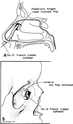 Bony Opening The bony opening historically was first made with an osteotome and mallet; however, more precise instruments are now used to make the initial osteotomy, such as a high-speed rotary drill. After either method of initial osteotomy, the bony opening must be enlarged from 1.5 to 2 cm with side-biting rongeurs. The bony opening straddles the anterior lacrimal crest and should be anteriorly and inferiorly placed and large. Closure of the intranasal ostium is an important cause of failure of DCR.105 This opening should be made with preservation of nasal mucosa (Fig. 20). Sac and Nasal Mucosal Flaps The anastomosis between the sac and nasal mucosa has been performed in a wide variety of ways with H-shaped incisions in the sac and nasal mucosa, making posterior or anterior flaps. A nasal flap along at least one area of the ostium seems advisable to cover it with continuous mucous membrane and prevent fibrous overgrowth of the DCR opening. Anterior flaps alone with cautery of the posterior edge of the nasal mucous membrane seem to be the most popular.106,107 Our personal preference is an anterior flap of lacrimal sac mucosa (see Fig. 20A) and a posterior flap of nasal mucosa (see Fig. 20B) with internal splinting. In children, the surgeon must not occlude the DCR ostium with too much nasal mucous membrane, which would predispose to closure of the ostium. Splinting of the Ostium and Canaliculi Various materials have been proposed to serve as a temporary internal splint of the surgically created DCR fistula during the healing process to ensure its patency. The most popular are gauze or umbilical tape saturated with antibiotic cortisone ointment or a French rubber catheter.108 Either seems satisfactory, but the catheter is easier to remove in 2 weeks than the packing. Neither the packing nor the catheter ensures the proper alignment of the common internal punctum with the newly created fistula into the nose. Intubation of the canalicular system with silicone tubing using the Crawford tubes in addition to the other splinting material has been our practice.109 This is performed in an identical manner as described previously, except that the probes, after being introduced through the canalicular system and common internal punctum, are brought out through the DCR skin incision. The probes are excised from the tubing, and the tubing is then reinserted into the nasal cavity. A straight hemostat inserted through the nostril grasps the tubes and extracts them. The tubes are tied into a single loop with the intraluminal 6-0 silk suture. The silicone tubes are left in place 3 to 6 months after surgery. Complications INTRANASAL PATHOLOGY. An enlarged or diseased turbinate may extend and impede the DCR opening, which is usually just anterior to the tip of the turbinate; in such cases, the tip must be excised. Large intranasal polyps may also present an obstructive problem and must be removed. A high deviation of the intranasal septum may reduce the working space. However, only if the septum is against the lateral wall of the nose, as may occur in posttraumatic cases, does it preclude the success of the DCR. Biopsy samples should be taken of unusual tissue and sent for histologic examination to rule out a neoplastic problem. ANTERIORLY PLACED ETHMOIDAL AIR CELLS. In many patients who undergo DCR, the ethmoidal air cells have eroded into the lacrimal bone between the sac and the intranasal cavity.110 They are a source of intraoperative bleeding and may be a cause of postoperative closure if the patient develops ethmoiditis. If encountered, they should be completely removed from the area and stripped of their mucosal lining. Some cases of unusually large air cells between the sac and the intranasal cavity have been encountered; these have required a double osteotomy to reach the intranasal cavity, one into the air cells and the second from the air cells into the nose. The fact that the intranasal cavity has indeed been reached should be verified by passage of a probe or catheter through the nostril into the DCR opening into the sac area. CONTRACTURE OF THE LACRIMAL SAC. After long-standing infection or trauma, the sac may be severely contracted so that when it is opened, it is little more than a rim of mucous membrane around the entrance of the canaliculi at the common internal punctum. The chance of establishing a permanent DCR fistula into the nose is obviously lower in these cases. However, success may be obtained in many cases with internal splinting with silicone tubes, as previously described, and a rubber catheter, which is left in position for 3 weeks. The silicone tubing may be left in place for several months in these cases. INTRAOPERATIVE HEMORRHAGE. Minor but persistent hemorrhage that can be easily controlled may occur from the angular vessels. More severe, frustrating, and not as easily controlled hemorrhage can occur from the ethmoidal air cells and the turbinates. Proper positioning and an adequate amount of intranasal packing for vasoconstriction with 4% cocaine111 on umbilical tape in the intranasal cavity before the operation begins are mandatory. The packing should be placed to cover the lateral wall of the nose anterior to the middle turbinate and the turbinate area itself. All aspirin should be discontinued for 2 weeks before surgery because of its effect on platelet function. If general anesthesia is used, enflurane in the anesthesia is preferable to halothane because of its lack of vasodilation. Injection of the lacrimal sac area with 1:100,000 epinephrine and hyaluronidase is also helpful. Endonasal Dacryocystorhinostomy Intranasal approaches to DCR surgery were described more than 100 years ago. The more recent use of nasal endoscopy techniques combined with endonasal laser technology over the past 10 to 15 years has stimulated a renewed interest in this surgical approach to dacryocystorhinostomy.112–115 The modern endonasal DCR procedure may be performed using local anesthe