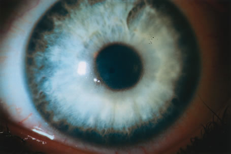 Additional findings in CHED may include band keratopathy, but bullae and corneal erosions due to edema are rare. There is no associated systemic disease, and genetic counseling is encouraged for asymptomatic carriers because of their risk of having offspring with severe visual loss. Although CHED is most commonly bilateral, unilateral cases may occur with affected persons maintaining good vision in the involved eye. This finding suggests that the disease has a different pathologic process from Fuchs' endothelial dystrophy. HISTOPATHOLOGY. The primary pathologic findings are found in Descemet's membrane and the endothelium. Abnormal collagen tissue and basement membrane material are found between the normal Descemet's membrane and the endothelium. Generally, the original anterior banded layer of Descemet's is thick and characterized by normal 110-nm bands. However, malfunction of the endothelium early in life creates a posterior collagenous material that is much more disorganized than the nonbanded collagen in normal Descemet's membrane. The collagen tissue posterior to the fetal anterior banded layer consists of large and small fibers interspersed among basement membrane material, a finding that suggests the endothelium produces original Descemet's membrane in utero and subsequently malfunctions. The endothelium in all cases of CHED is either absent, anomalous, or contains decreased numbers of endothelial cells. TREATMENT. If the edema from CHED is mild and nonprogressive, therapy is rarely necessary. When corneal opacification is severe enough to cause amblyopia, nystagmus, or strabismus, surgical intervention is indicated. A report of 40 patients in 1997 suggests that penetrating keratoplasty in CHED may be successful and has a higher rate of success in cases of delayed onset rather than onset at birth. Early surgical intervention is justified to prevent progression of amblyopia.69 Iridocorneal Endothelial Syndrome HISTORY. The ICE syndrome, a term coined by Yanoff, is best thought of as a continuum of one disease that includes the iris nevus (Cogan-Reese) syndrome, Chandler's syndrome, and essential iris atrophy. Several anecdotal reports describing unilateral glaucoma and iris abnormalities with corneal edema were made in the early 1900s. These cases were later identified as essential iris atrophy. In 1956, Chandler70 described similar cases with more corneal edema and less iris change, suggesting a variant form of essential iris atrophy referred to as Chandler's syndrome.71 Cogan and Reese72 reported cases of iris nodules in patients with findings of corneal edema, hence the birth of Cogan-Reese syndrome. CLINICAL MANIFESTATIONS. ICE syndrome is a unilateral, acquired disorder of the corneal endothelium, which develops in young adults. The spectrum of the disorder can be detected by slit lamp biomicroscopy and may include iris nodules, peripheral anterior synechiae, correctopia, elevated IOP, and varying degrees of iris atrophy and corneal edema (Fig. 12). Campbell and colleagues73 suggested that an abnormality of the corneal endothelium may be the fundamental change in all of these disorders and is responsible for the corneal edema. Dysfunctional endothelium and an abnormal membrane of endothelial cells may grow onto the iris, causing an iris nevus appearance with tufts of iris sticking up through the sheet of dysplastic endothelium. The dysplastic sheet of endothelium can contract and pull the iris stroma in its direction into the angle, effectively pulling the iris into shreds and drawing the pupil toward the contracted tissue. Chandler's syndrome, or corneal edema with increased IOP, is caused by abnormal endothelial cells from the cornea growing across the trabecular meshwork. Bourne74 showed that there can be partial involvement of a cornea with abnormal endothelial cells interspersed within populations of normal endothelial cells on specular microscopy. Specular microscopy may show a loss of cellular definition and hexagonal shape, along with increased granularity, polymorphism, and eccentric dark areas appearing in affected cells. HISTOPATHOLOGY. The abnormality of the corneal endothelium initially results in corneal edema and disruption of the normal endothelial cell architecture. The cells grow in a membrane and may cover the angle, causing glaucoma, or may grow onto the anterior surface of the iris and cause the classic findings of the iris nevus syndrome. The “nevi” seen in the ICE syndrome are actually spots of normal iris surrounded by the membrane. Subsequent contraction of the membrane can cause anterior synechiae and distortion of the pupil characteristic of essential iris atrophy. TREATMENT. Treatment of ICE syndrome is directed at controlling glaucoma in conjunction with management of corneal edema. Treatment of glaucoma is initially effective using topical aqueous suppressants, and later may require partial-thickness filtering procedures with or without a prosthetic valve.75 When the cornea becomes sufficiently opaque to impair vision, patients may get visual improvement with penetrating keratoplasty, although penetrating keratoplasty itself does not improve the IOP.76 MECHANICAL TRAUMA TO THE ENDOTHELIUM Mechanical trauma to the endothelium results from external forces directed toward the eye. The majority of these forces are iatrogenic and can compromise function of a normal endothelium or, more frequently, disequilibrate an endothelium that may already be compromised. Intraocular surgery, such as cataract and glaucoma procedures, posterior chamber gas implantation, and posterior chamber silicone oil placement, may have damaging effects on the endothelium. Mechanical trauma may occur from corneal trauma as well. A loose intraocular lens (pseudophakodonesis), foreign body, or lens fragment can traumatize the corneal endothelium by repeated impact. Cataract Surgery Cataract surgery is one of the most common causes of iatrogenic corneal edema. Most corneas man